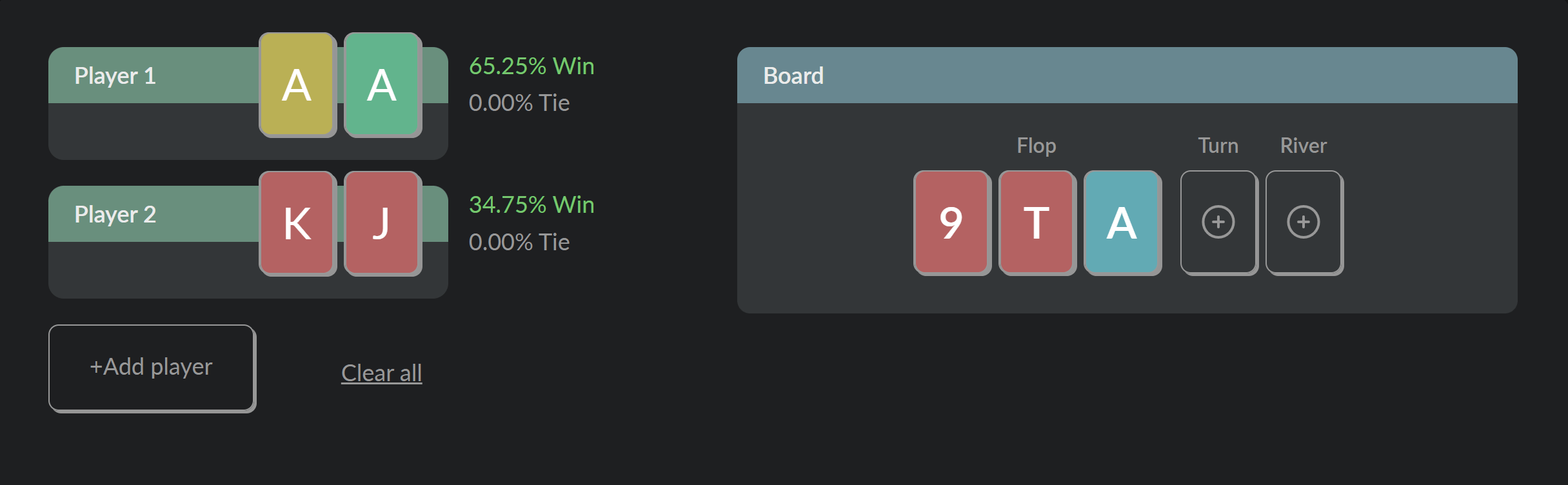 17 May 2024 bet sizing hand charts HUD outs pot odds ranges Calculating equity and outs in poker - why is it important? What are the odds and how to determine them? To make life easier, there are specialized online calculators, which we’ll fully describe in the material below. How to use a poker calculator? With the help of a calculator, you can determine the odds of winning a particular poker hand against any cards or several hands at once. For example, pre-flop or on different boards. Good news is that such a serious type of analysis can be done for free and literally in a couple of clicks. Go to the Poker Odds Calculator page → The poker equity calculator counts the odds of one poker hand winning against another one on the preflop, flop, turn and river. Roughly speaking, it takes a given situation and calculates its options a huge number of times, getting quite accurate stats. Here’s a brief example on how to correctly use such calculators: First, select the discipline you need: Hold'em, Shortdeck, or Omaha. The last one comes in three varieties: classic, five-card, and six-card. Next, specify the number of players whose cards will matter in the current deal. For example, if you want to compare 3 hands, leave 3 players (you can have more if you don't specify their hands. Don’t worry, it won't affect the result. Then assign specific cards to each of them. For example, one to KT, another one to 88, and the last one — to AJ. You'll find the cards of all four suits to choose from below. If you don't specify flop and turn, you will get a comparison of the odds of winning on preflop. Choosing board hands you’ll get a comparison of the poker odds of winning on a particular betting round. How does hand seniority work? The key concept for determining the strength of a poker hand is equity. Simply put, it is your chance of winning the pot. For example, if it's 80%, you can safely say that your hand has 80% equity in the hand. So what does «equity» have to do with it? It's easy: the chance of winning the hand is easily represented as a fraction of the pot that you are claiming. For example, if the pot is $100 and you will win it 80% of the time, that means that over an infinite distance, you will win $100 4 times out of 5 and lose $100 once. So, 80% of the time you have $100 in the pot, and you are claiming $80 on average — that's how equity works. Any mathematical models in poker work over a long distance, because the outcome of any given hand may vary. It is possible to lose 99%, but it will not happen very often. Any odds calculator can demonstrate this. Equity can change, depending on your hand, the cards in your opponent's (or opponents') hand, and how close you are to the showdown (i.e. preflop, flop, turn, or river). If you have Aces, almost any equity calculator will tell you that against a random hand, you’ll have about 85% to win. That's why it's always a good idea to put more money in the pot preflop with Aces. The reason is simple — there's only a 15% chance of losing! But in the later rounds, equity can drop, and then you need to play more cautiously. Let’s further look at a couple of examples to make it clearer. Examples of comparing hands in poker Suppose you still have the same Aces and you are playing against an opponent who has a jack and queen off-suited (JQo). If you bet all your chips preflop, you will win about 86% of the time. If you continually bet like this, you'll get rich very quickly — for every dollar you invest, you'll get 86 cents on top. But that's preflop. Now let's imagine that the cards are the same, but we invested all the money not on the preflop, but on the flop, which suited our opponent: 9TJ. We're still ahead, but we don't feel so confident anymore, the hand has less than 55% to win. The thing is that there are still 2 streets ahead (turn and river), and our opponent is helped by a lot of cards that can fall out: Eight and King will give a straight, Jack will give trips, and Queen will give two pairs. Experienced players have an approximate (and some are very accurate!) idea of what equity some hands have against others. In such cases, the calculator will help a player to understand. Other poker probabilities Everything in poker is based on probability — including that fact of how often you’ll get different hands on preflop. As we know, there are 52 cards in the deck, so it's easy to calculate how often the dealer (or a random number generator online) will deal you a particular hand. For example: The chance of seeing the pocket aces is 0.45%; If you get not only aces but also kings, it will happen twice as often — in 0.90% of cases; Any pocket pair you will get is not that rare, the chance of it is 5.90%; One-suit AKs will come 0.3% of the time, and mixed-suit AKs three times as often (0.90%); Two random cards of the same suit come almost every fourth time — it’s 24% of the time. As we mentioned above, every hand has a certain chance of winning against another hand (or range). You can't memorize them all, but there are a few key situations that will come up most often — especially in all-in preflop in tournaments. Here they are, with examples in next tables: Situation Equity Pocket pair vs. two overcards (77 vs. KQ) 54% Pair vs. lower pair (KK vs. JJ) 81% Pair vs. one overcard (88 vs. A7) 71% Two cards vs. two higher cards (78 vs. JQ) 37% Same, but only one card is higher (JT vs. A8) 45% Dominance (KQ vs. QJ) 74% But that's all preflop, and when playing on the flop and turn, it's important to know how often your draws will be strengthened. It's nice to get a ready-made combo on the flop, but that will rarely happen. For example, here are the odds of getting caught on the flop with a promising hand — for example, 89 suited: Situation Equity Flush on the flop 0.94% Flush draw (two cards of the same suit) 10.94% Backdoor flush draw (one card of the same suit) 41.60% Straight on the flop 1.30% Open-ended straight draw (fl