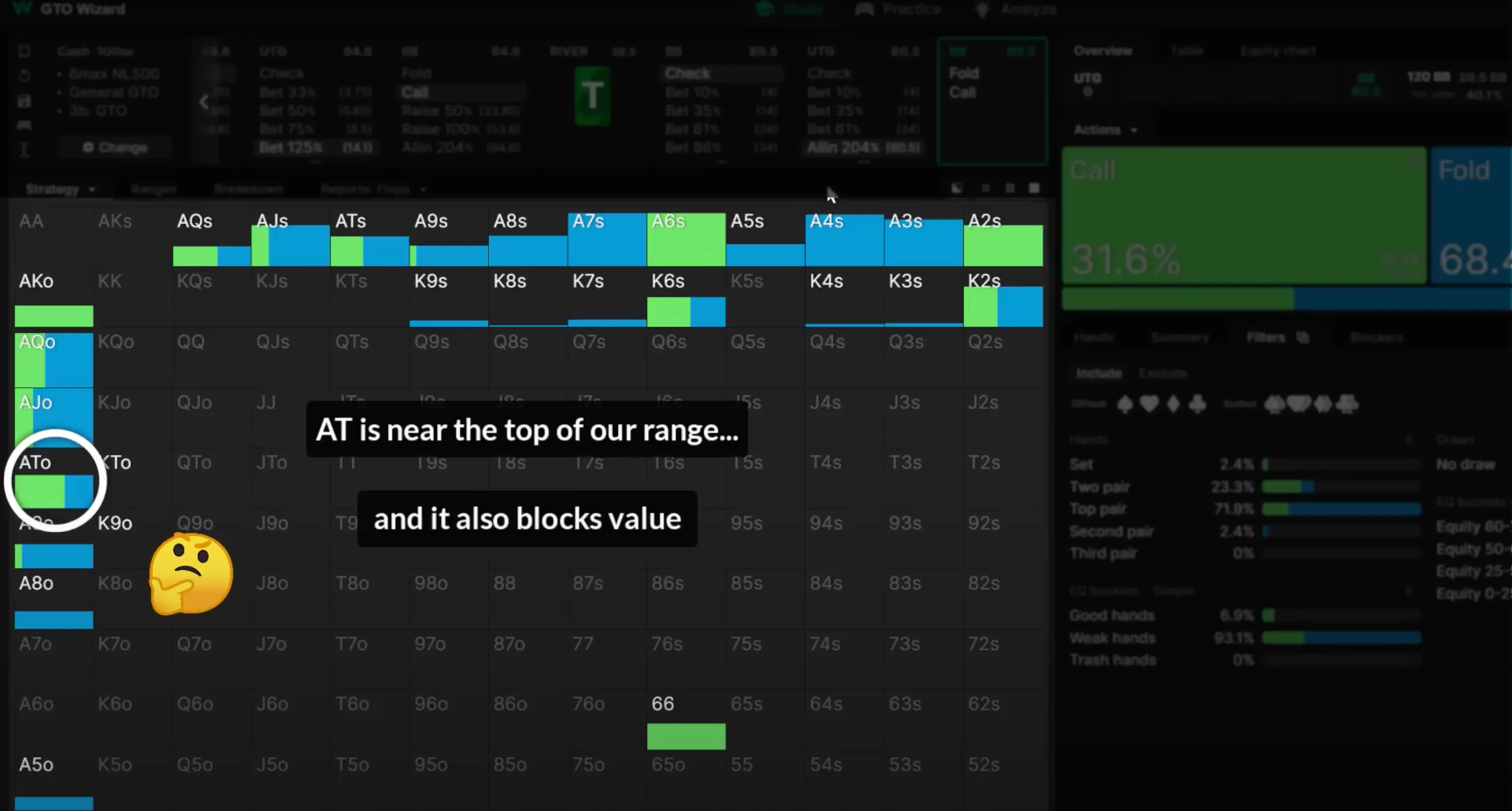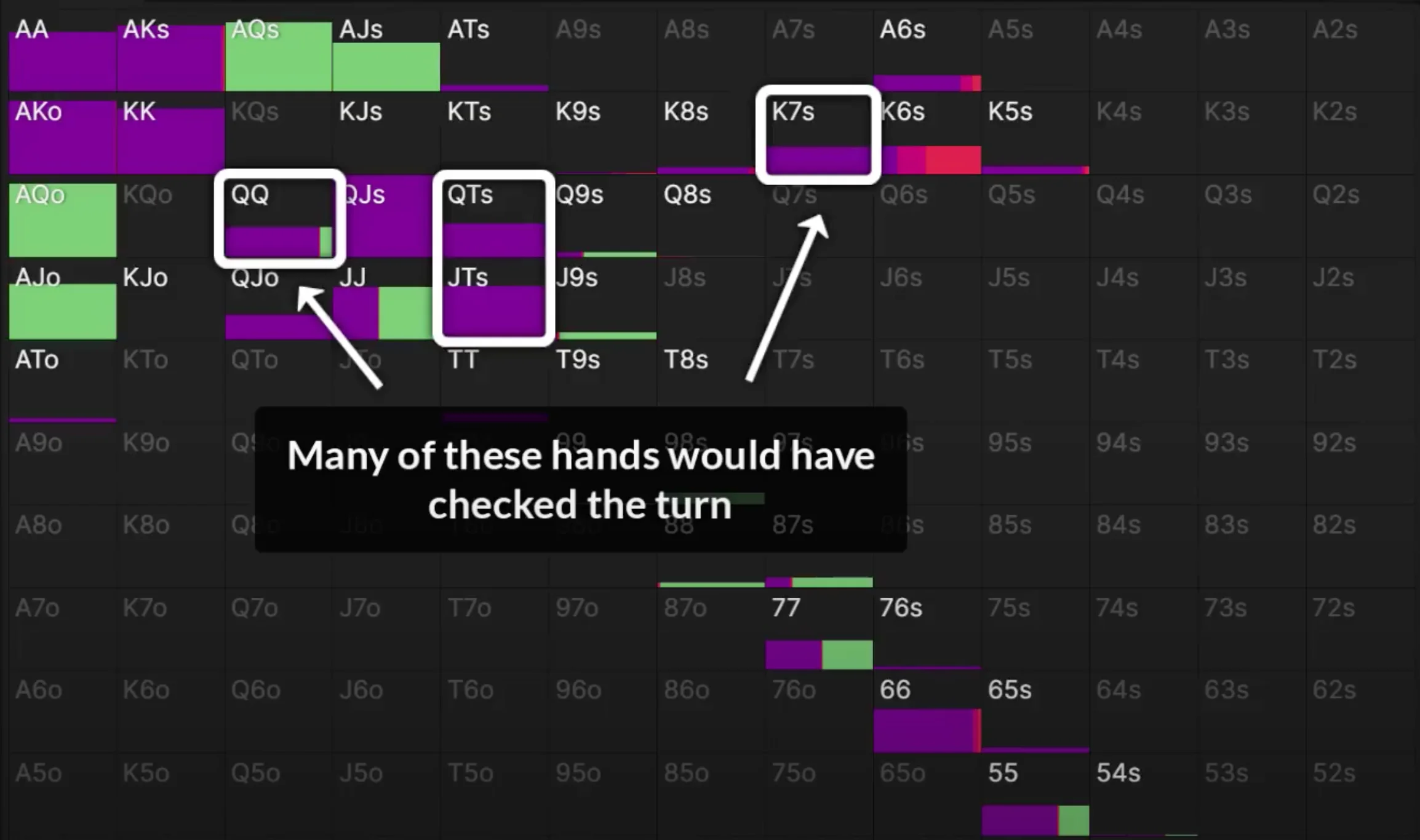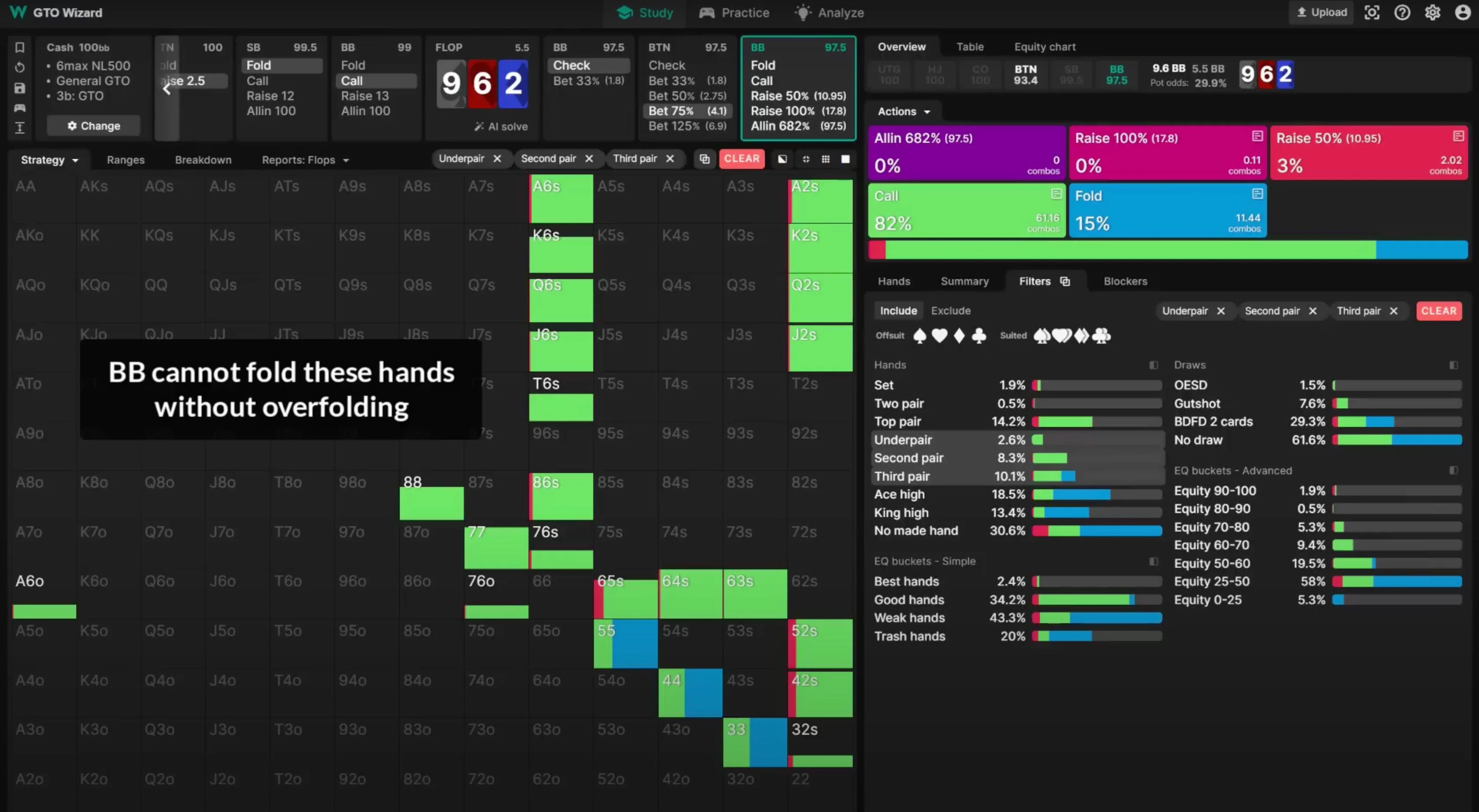 29 Jul 2024 blockers bluff catching moving up stakes ranges UTG / EP These mistakes could be costing you money. Which ones? Let’s find out with today's TOP 3. #1: You try to be balanced in every spot This includes trying to achieve the perfect ratio of value and bluffs, as well as always calling down the top of your range when facing a bet. You’re basically trying to play like a human solver, but for some reason, it’s not working out. The problem with being balanced is that you leave no room for yourself to exploit weaker players. Regardless of what stakes you play, there are a ton of spots that your opponents are constantly messing up. If someone is overfolding the river, you just want to be bluffing all your air. If someone is overcalling, you want to give up all your air. It might sound really obvious, but somehow, the more time we spend grinding solvers, the more we forget about this simple fact. Would we be better off without solvers then? Well, not really! Solvers are incredibly useful tools that can give us a huge edge over our opponents — but just like any tool, we need to be using them correctly. Take this hand for example. UTG raises, and we defend the BB with AT. UTG c-bets the flop and turn, and we make a pretty standard call with the top pair. The river is a T, giving us two pairs, and our opponent goes all-in for 2x the pot. Here’s how NOT to use the solver — we input the hand, and look at what AT does facing a jam. The solver is calling most of the time, so we conclude that calling is the right decision. Maybe we even think about why the solver is calling: here AT is one of the strongest hands we can have, and we even block some of UTG’s value. But the fact is, none of this will improve your winrate in practice. Instead, here’s how a good player would use the solver: they input the hand, and notice that AT is indifferent when facing a jam. They understand that indifferent hands are very sensitive to villain’s mistakes, and that it’s necessary to look at UTG’s side of the strategy, in order to better understand how an actual player might be deviating. They see that UTG needs to bluff all of their Tx, and even hands like Kx/QQ to be balanced. They conclude that no one is doing this in practice, therefore AT has to be a fold. In short, solvers are not there to tell us how to play a hand. Instead, they are there to show us how our opponents are messing up, and what we can do to take advantage of that. On the river, even a small mistake can open up a big exploit. So the way to make money is not to try and be balanced ourselves, but rather to go all out and exploit our opponent’s mistakes. #2: You focus too much on blockers You fold when you have bad blockers and make big hero calls “because you have good blockers.” But for some reason, you’re always running into the nuts. The thing is, blockers aren’t something that magically makes any call profitable. Instead, you want to think about them as a kind of juice. For a pot-sized bet, our opponent needs to have two value hands for every one bluff. If they can do that, then the EV of our call is exactly zero. If our hand has good blockers - that is, we block value and unblock bluffs, then this adds a bit of juice to our call. This juice can be worth anywhere from a fraction of a big blind to five or even ten big blinds — it really depends on how strong our blocker effects are. Occasionally, blockers can turn a losing call into a profitable one. But this requires your opponent to only be slightly underbluffing. If the extent of the underbluff is large, then no matter how much juice you add to it, there is no way that the call can be profitable. Let’s take a look at the same hand and see how this works. We previously concluded that AT should be a fold because most players will not be balanced when betting the river. But what if we account for our hand’s blockers? We block AA and AK, so this should increase the EV of our call, right? Well, it turns out that there is nothing special about AT. Even though we do block some value, we also block a lot of the QT/JT that need to be bluffing on the river. So our blockers don’t really add any juice to our call. With a hand like A6, we would have a far more interesting decision. According to the solver, our blockers give us about 3 big blinds worth of juice. This is because the 6 blocks more value hands than the T and also unblocks more bluffs. So it would still be a reasonable hand to call with, even if our opponent was under bluffing slightly. But of course, if we thought our opponent was massively under bluffing, then we should just be folding all the time — regardless of how good our blockers are. #3: You always bet big on wet boards You’re terrified of getting outdrawn, so your entire strategy revolves around charging your opponent the maximum when you think they have a draw. Your hope is that they fold, but if they do decide to call, then at least you made them pay for it. The problem here is that we are focusing on a relatively small part of our opponent’s range. Flush draws typically make up 10-15% of ranges, so we shouldn’t be basing our entire strategy around them. Instead, we want to choose a size that works well against the villain’s overall range. Generally speaking, big bets have the effect of narrowing our opponent’s range. The bigger we bet, the more they can fold, leaving behind a range that gets progressively stronger. This is fine if they have a small proportion of nuts: in this case, they either have to pay us off with plenty of bluff catchers, or overfold and allow our bluffs to make a profit. Take a board like 962 for example. Here, we can bet quite large with our overpairs and still get plenty of value from hands like the second and third pair. The caller cannot avoid paying us off with these weak bluff catchers because on such a dry board, they don't have anything better to defend with. But as the board gets wetter, the p