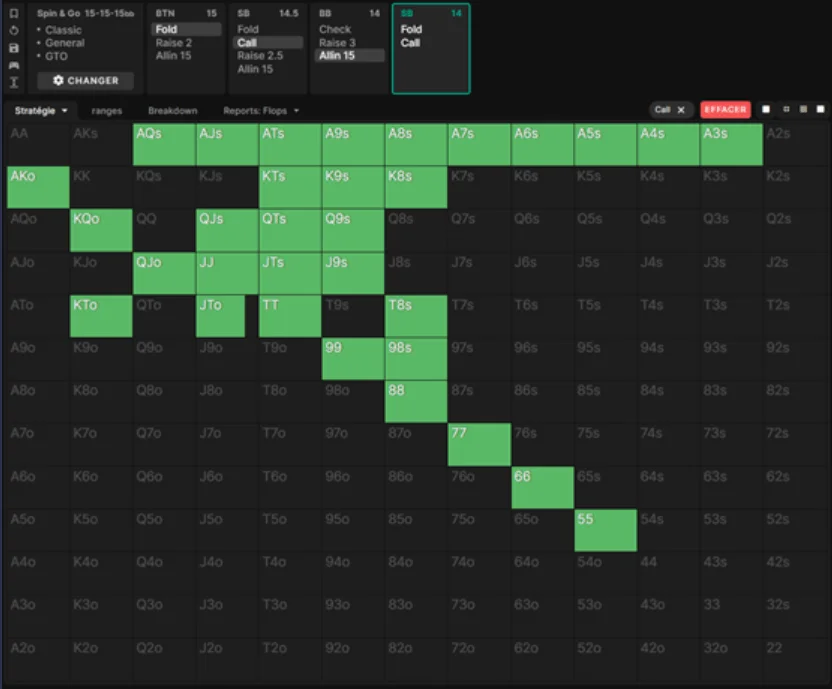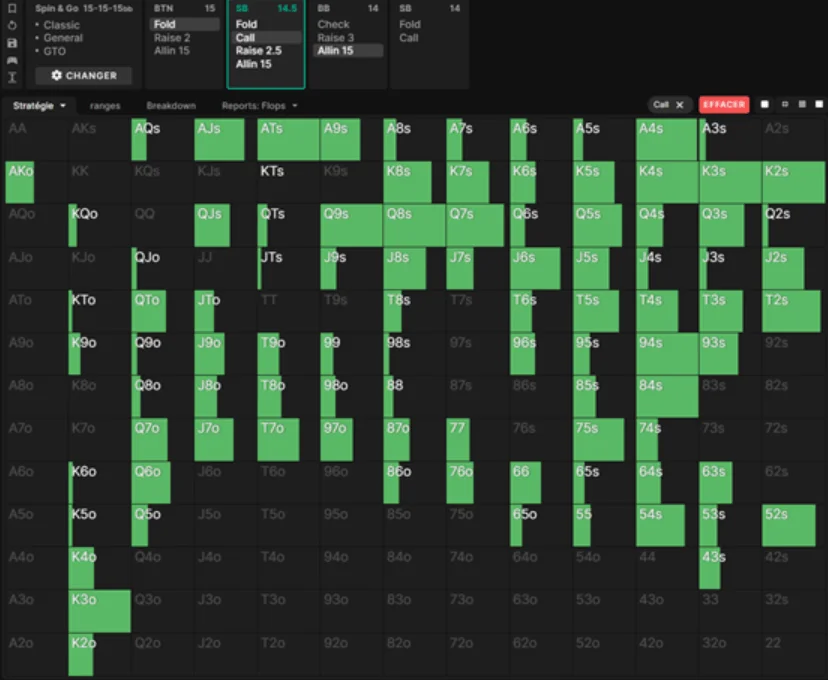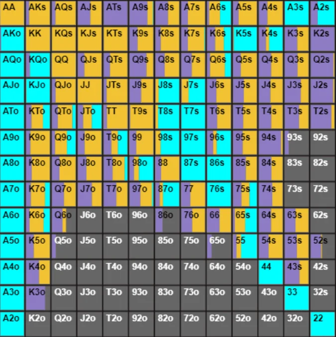 02 Mar 2024 exploit GTO In poker it is important to understand the theory before delving into an exploitative game. GTO strategy (Game Theory Optimal) is a mathematically unexploitable strategy, but it may not always be the most effective way to win more money. How does an exploitative poker relate to GTO? While an exploitative game may be more profitable in certain situations, it is crucial to have a solid foundation and understand at least the basics of game theory. Definition of GTO The GTO game is an unbeatable strategy that cannot be outplayed in the long term It involves mixing different actions with the same combos, and it is so complex that no human can play GTO perfectly. The GTO strategy achieves a perfect balance between value and bluff, making it, at best, possible to have a 0 EV (without rake). If two opponents played GTO perfectly, they would break even against each other. Here is an example of a GTO range in the SB versus BB scenario with 15 blinds deep, where you can see a variety of combos mixed between limp (purple), open-raise (orange), and open-shove (blue). SB vs BB 15 bb Why is it necessary to understand GTO to play an exploitative game? To exploit an opponent, you first need to identify how they are exploitable — in other words, how their game deviates from a theoretical optimal one. To take advantage of an opponent's mistakes, you need to spot where they differ from the GTO. Once you identify these differences, adjust your game accordingly. But to make these adjustments effectively, you need a solid theoretical foundation. That's why understanding poker theory is crucial. When to use GTO and when to use an exploitative poker game? GTO provides overall stability and invulnerability, whereas an exploitative game involves unbalancing one's strategy to exploit identified tendencies of opponents. An exploitative game is best suited against specific players and can be more profitable if executed properly. Although top regulars may play GTO as closely as possible, no human can perfectly implement it in a real game due to its complexity. This is why it is more profitable to exploit opponents' leaks, especially against recreational players whose strategies deviate significantly from the optimal. Generally, we should employ a GTO-like strategy primarily against unknown regulars whose leaks we have not identified yet. In summary, the closer an opponent plays to GTO, the more inclined we should be to adopt a similar strategy. Conversely, when our opponent shows us a more unbalanced moves, it becomes more optimal to adjust and exploit his deviations. That being said, you should be careful. When exploiting opponents there is a risk of being counter-exploited. By definition, and unlike the GTO game, an exploitative strategy is also vulnerable to exploitation in return. However, this is not a significant concern against less skilled players (aka fish). Developing an Exploitative Poker Strategy: Key Focus Areas As mentioned earlier, an exploitative poker strategy should evolve from observing deviations from a basic GTO game. While the theory is undoubtedly complex, we'll discover that it's not mandatory to have an in-depth understanding to implement exploitative strategies! Which situations should be studied as a priority? The answer to this question is pretty obvious: Explore at first situations that are more significant to your long-term winrate Generally, the most profitable scenarios are those that are encountered frequently, such as preflop spots (played every hand), followed by the flop, turn, and river. Even within preflop, some situations are more common than others. For instance, in Spin & Go, when you're in the BB, you'll often face a 2 bb open-raise from the BU with a fold from the SB more frequently than facing an open-raise and a 3-bet. Consequently, it's crucial to prioritize working on the BB vs BU spot rather than BB vs BU+SB (3-bet). Preflop game Prioritizing the preflop strategy is crucial for winning the most chips. To begin, it's essential to start with GTO preflop ranges. However, due to their complexity, these ranges are often not directly applicable and need to be simplified. Therefore, adjustments is key as they must be adjusted to exploit the deviant tendencies of our opponents. Studying the frequencies of opponents' actions in a specific situation is a crucial step in adapting to it. However, it's equally important to closely examine the types of hands played in different ways. For example: The theory: We will use the GTO Wizard software to study a situation. In BvB, when you call and get raised all-in, you are supposed to call 20% of the time. Theoretical limp range in SB (19.5%): Theoretical ISO AI (Isolation All-In) range in BB (12.8%): Theoretical AI limp/call range in SB (20%): Fish Frequencies: Based on data, recreational players (aka fish) go all-in after limping 20% of the time, which quite matches the recommended frequency. However, it's noteworthy that their VPIP in the SB is 70%, compared to the 62.3% in theory, and they limp 40% instead of the theoretical 19.5%. (These results were obtained through the Range Research in the Hand2Note database. We could conclude that, given their higher VPIP and limp frequency, it's sufficient to raise more to exploit the marginal hands they have. However, we need to delve into their range. Fish limp range in SB (40%): Fish Limp/Call All-In range in SB (20%): The limp/call-All In frequency is correct, but the whole range is too wide. We notice the presence of very strong hands that shouldn't be there (particularly QQ+). These hands counterbalance with many limp-calling hands that should have been folded. Additionally, medium-strength hands are frequently called against an ISO AI. Considering these factors, we can modify our approach — raising more hands all-in, but in a more selective manner. Source: spinelite.fr