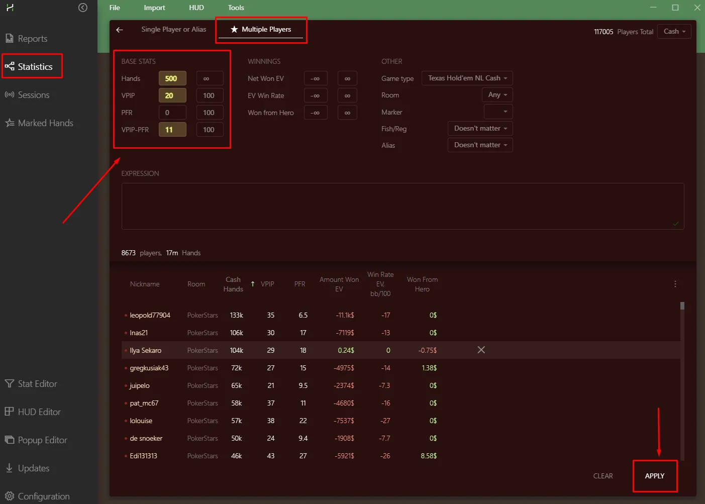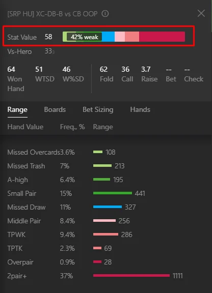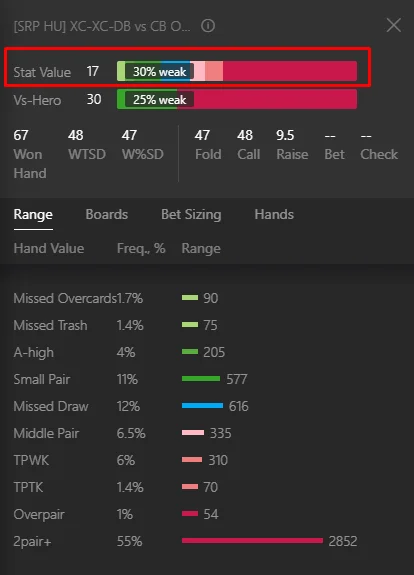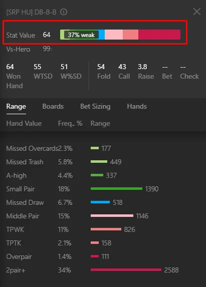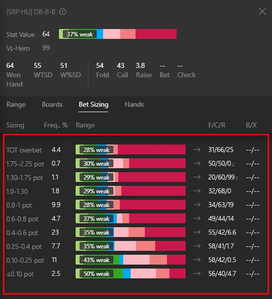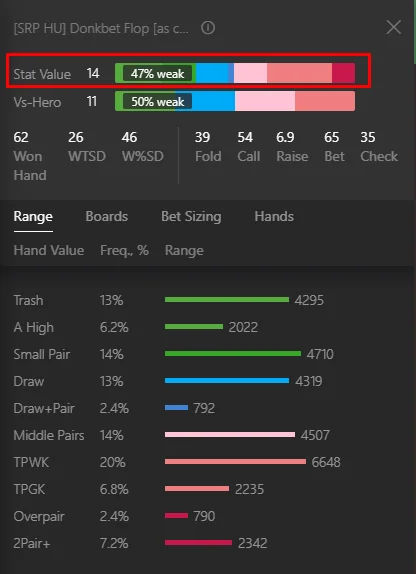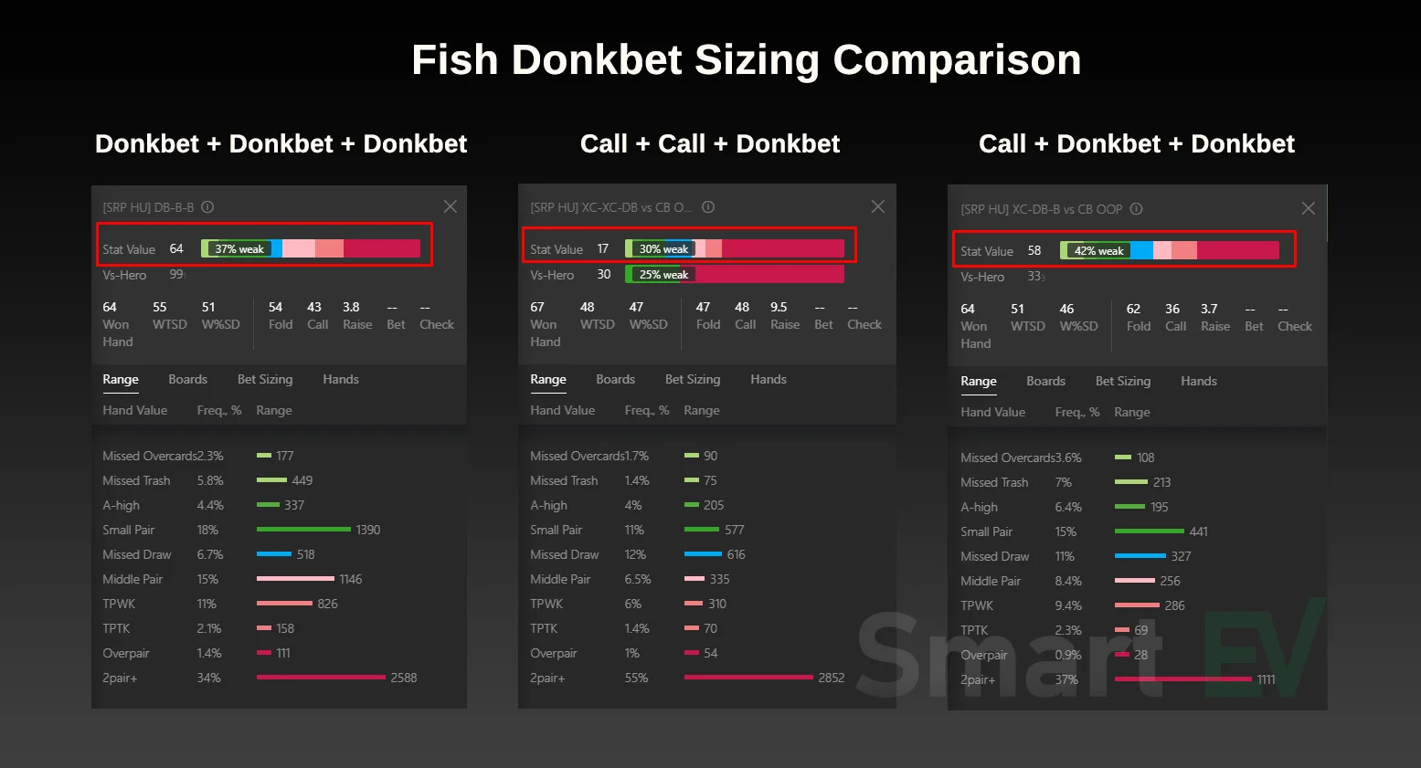 27 Feb 2024 We know that most of our winrate as poker players comes from recreational players, known primarily as “fish”. So it’s necessary to properly adapt our strategy against them in order to get maximum value and win as many big blinds as possible. How do we identify a fish at the poker tables? This kind of players share common things and playstyles, such as: Limping (not raising preflop). This is the most common leak from weak players: call the minimun preflop bet (1bb or comple 0.5bb when they’re on Small Blind). High gap between VPIP and PFR, usually more than 8 makes the player unbalanced between his calling and raising range. Calling too much against bets both preflop and postflop. Because they want to see a lot a flops and see the next street for hitting, even when the pot odds are quite bad. Donkbetting: Recreational players like to bet out of position when they’re not the aggressor in the hand. I am going to deepen these lines in this article in order to explore the fish behavior, tendencies and how we can adapt for exploitation purposes. Exploring different donkbet lines using Multiple Player Reports Let’s see how the fish generally performs in donkbetting. For this I’ll use the Smart Research Popup package, a complete set of very useful popups for deep database analysis. To do this, I created a new report in Statistics tab > Multiple Players and put different parameters in Base Stats. As you can see in the image below, I wanted to filter players with: 500 hands or more. +20 VPIP and any PFR. VPIP-PFR gap of +11. So in this way Hand2Note will gather all players that match these parameters and create an alias showing all statistics ready to start studying! Once the report is ready, Hand2Note will show up the results on the popups. Let’s explore how the recreationals plays as callers OOP in single raised pots: We have a ton of stats here, but we’ll focus only on the most common donkbet lines using postflop histograms and more useful statistics in extended popups, such as range composition, percentage of weak hands and sizes. Overall Flop Donkbet Stat By clicking on the overall donkbet flop stat, an extended pop-up window will appear on the right and show many interesting and useful statistics: As we can see, overall fish is donkbetting 14% with 47% of weak hands in this spot! We can also see showdown stats, next actions and range composition. This may seem a little bit obvious, but let's move on to other donkbet lines on the river. Triple Donkbet (Donk Flop + Donk Turn + Donk River) We open raise and a fish calls out of position, then he donkbets all streets. When the fish takes this line, the range will contain approximately 37% of weak hands (10% less than the donkbet on the flop). We can also click on the Bet Sizing tab and see its sizing tendencies: Now this is starting to get more interesting. There are significant changes in the range composition depending on the size, so based on this we conclude that: The most used sizing in this line is 40-60% pot (35% of weak hands). Overbet sizings are less frequent (28% of weak hands). 💡 The smaller the size, the higher the % of weak hands and bluffs. The larger the size, the stronger the range and less weak hands. Whenever you face this line and the fish barrels the river, pay attention to the size. Keeping this in mind will make your bluff-catchings on the river much easier. XC-XC-DB (Check-Call Flop + Check-Call Turn + Donk River) This is another common line the fish usually takes, calls two barrels and donks the river. It contains a different outcome for his range composition: At the first impression, this line is more underbluffed than Triple-Donkbet because it contains 7% less of weak hands. We can interpret this because the player calls seeking for draws or just improve his hand, otherwise he’ll check call or check fold. How about the sizings in this line? The pattern is almost the same as the 3-Donkbet line: High sizings contains stronger hands and sizings <80% contains +30% of weak hands. XC-DB-DB (Check Call + Donkbet + Donkbet) Fish calls the flop, donks the turn and donks the river. This is the last common line we’ll explore and surprisingly it is the more interesting one: Notice how this line is way overbluffed than the other two, containing 42% of weak hands. A ton of bluffs! This whole line has 51% of Went to Showdown (WTSD) (!!) and 62% of Fold in Next Actions, that means, the fish is folding -on average- 62% of time time against a raise on the river, and calling 36%. Let’s find out if the sizing pattern repeats again: Once again, the sizing pattern continues: Most used size is 40-60% pot. +40% of weak hands with sizes <80% 37% of weak hands on all overbets. We can conclude that XC-Donk-Donk is the most overbluffed line. Comparison & Conclusions The are significant differences in donkbet lines from fish, not all donks are the same on the river. [Call + Call + Donkbet] is the most undebluffed, while [Call + Donk + Donk] is the most overbluffed. The sizing tell is the same in all donk lines. Big bets = more strong hands. Small bets = more weak hands. By recognizing this, your river decisions against donk bets will improve dramatically, becoming more skillful against recreational opponents and shooting up your winrate 🚀 You can study infinite spots with the powerful features of Hand2Note 4 and Smart Research, getting the statistical edge at the tables crushing your opponents!