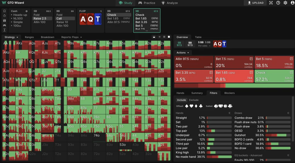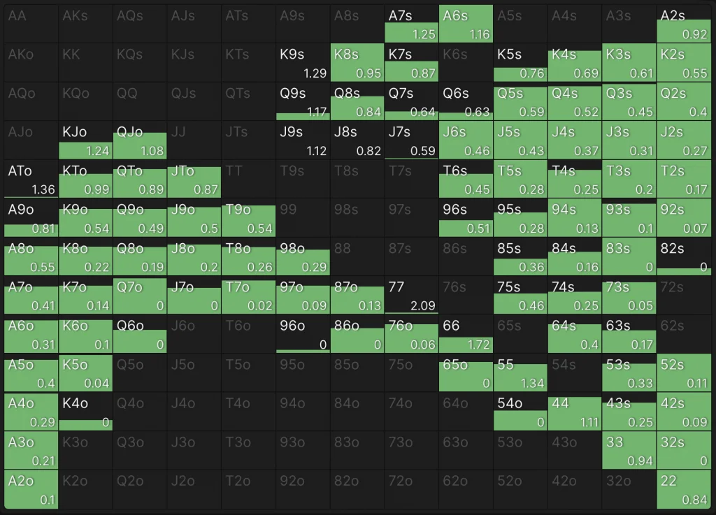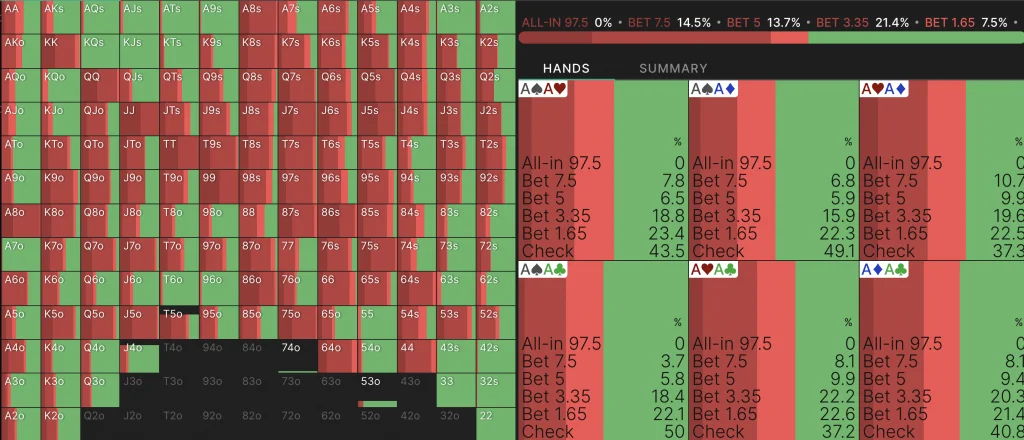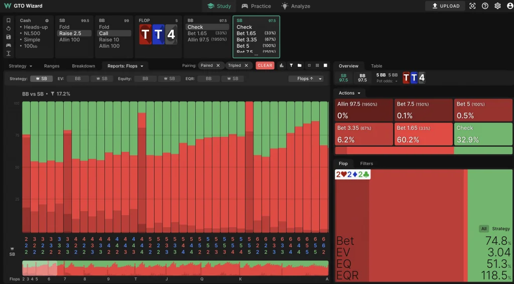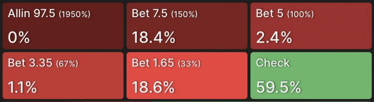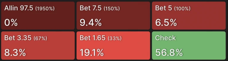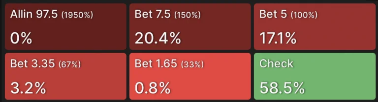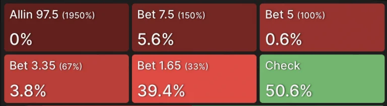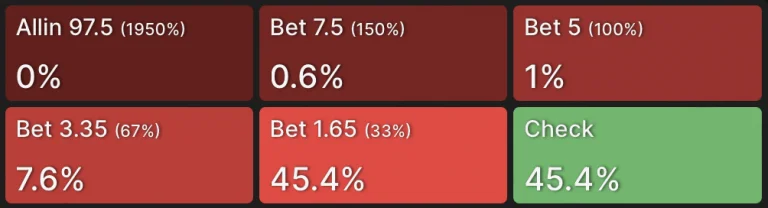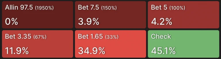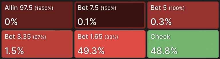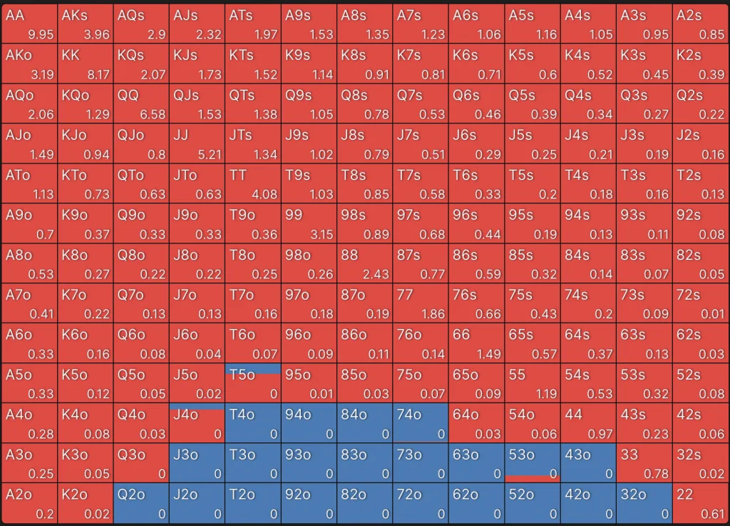 24 Aug 2024 GTO heads-up ranges Heads-up poker differs significantly from the strategies used in a 6-max table. To become strong in heads-up pla you need to study specifically for it. But many players don’t prepare intentionally for heads-up. So if you know how to play heads-up in more detail, you can gain a big advantage over the field. In this article, we'll explore how to effectively approach heads-up situations. What is Heads-Up? If you're reading this article you probably already know what a Heads-Up (HU) is, but just to be sure, let's review what it is. Heads-up refers to a poker game where only two players are involved. This can happen at a 6-max table where four players fold, or in scenarios where the game starts with just two players. For this article, we define heads-up as a game starting with only two players at the table. Heads-Up Rules Before diving into strategy, let’s quickly review the rules. In heads-up play, the Button (BTN) and Small Blind (SB) are the same player. The cards are dealt starting with the Big Blind (BB) and ending with the SB. This may confuse some, as in other formats, the SB is dealt first. The action begins with the BTN (SB). Heads-Up Strategy To effectively play heads-up, focus on these three key aspects: Play aggressively Consider wide ranges Exploit your opponent’s tendencies Play Aggressively Heads-up play is far more aggressive compared to 6-max and full-ring formats. Players accustomed to 6-max might be surprised by the level of aggression involved in HU. In heads-up, the SB and BTN are the same. Normally the SB is out of position (OOP), but in heads-up, the SB is in position (IP), so he can try to steal blinds with a very wide range. This chart is the SB's opening range at 2.5bb (5% rake, 0.3bb CAP). It shows that you can open almost all cards except T4o-, 74o-, J3o-, 43o-, Q2o, 32o. In particular, you can open all suited cards. The SB can open-raise with around 80% of hands in a HU. This chart shows how the BB should defend against the SB's 2.5bb open. You can defend 63.6% of the time. Out of those, 6.5% should be with a 3-bet. It's surprising to see that the 3-betting range includes Q8o, 93s and T4s. The SB's defense against this BB 3bet (SB: 2.5bb open, BB: 10bb 3-bet) is also wide. QTo should 4-bet 33% of the time, and J4s — 62.6% of the time. Consider Wide Ranges Given that the BB defends against the SB’s open 63.6% of the time, the ranges post-flop are extremely wide. Let’s look at an example: You're in the SB with Q♣9♠ and open for 2.5bb, and the BB calls. The flop comes 8♠6♥4♦︎. BB checks, SB? In such a situation, both players’ ranges are wide, leading to a variety of possible actions. The flexibility of options is reflected in the complexity of range charts. Exploit Opponents Unlike 6-max tables, where you may not often face the same opponent, heads-up play involves continuous confrontation with the same player. Also, as mentioned earlier, in heads-up, you play with a wide ranges, so you can quickly identify and exploit your opponent's tendencies. For example, 6-max players who aren't familiar with heads-up may have narrower 3-bet or 4-bet ranges. If you see a 3-bet or 4-bet from such an opponent, you can be sure they have a stronger range than what a solver suggests. In this way, by adopting a more exploitative strategy in heads-up poker, you can increase your win rate. Heads-Up Flop Strategy For this guide, we will focus on heads-up strategies for 100bb cash games with SRP, using GTO Wizard for assistance. The stack sizes or formats might be different (like MTT or Spin&Go), but the methods introduced here will be very helpful for analyzing other formats. The goal of GTO poker is to create a strategy that is hard to exploit, not to create the strategy with the highest EV. In practice, opponents often deviate from GTO. It is important to make the most profit from these deviations. The strategies introduced here will help you find these deviations. First, check the overall frequencies. While these frequencies alone might not be very useful, but it will give you an idea of whether it's above or below average. As a general rule: The more nut advantage you have, the larger the bet size will be, and the greater the equity advantage the more frequently you will bet. The ranges for BTN (SB) and BB are as follows: BTN (SB) range BB range You can get these pre-flop ranges for free in GTO Wizard. If you're interested, you can sign up to check them out. Special Boards Monotone and paired boards are treated as special boards. On these board textures, large sizes are rarely used. Monotone Board Paired Board On monotone boards, the check frequency is 61.8%, the 33% of the pot bet — 21.3%, and the 67% of the pot — 15.2%. Since there is often no nut advantage and equity is close on these flops, overbet is a rare option. Even with small bet sizes, the betting frequency decreases. On paired boards, the check frequency is 32.9%, the 33% bet — 60.2%, and the 67% bet — 6.2%. Even though there is no nut advantage, there is a significant equity advantage. Paired boards let you maintain the pre-flop advantage, so the frequency of small bets increases. Boards with a Straight On straight boards (like 754 or QT8) overbets are rarely used. However, unlike the two board types mentioned above, 100% and 66% bets become more often. All straight flops Except for A-high and K-high straight flops On straight boards, the check frequency is 52%, the 33% bet is 16.1%, the 67% bet is 19.8%, the 100% size is 9.2%, and the 150% size is 3%. Overall, the 150% size is used quite often. However, many of these cases are on high card flops (like AJT or KQT) where overbets are frequently used. When excluding A-high and K-high flops, the check frequency is 51.1%, the 33% bet is 17.5%, the 67% bet is 23%, the 100% size is 7.5%, and the 150% size is 1%. A-High Boards A-high boards are divided into six types: A-H-H (Ace-High-High) A-H-M (Ace-High-Mid) A-