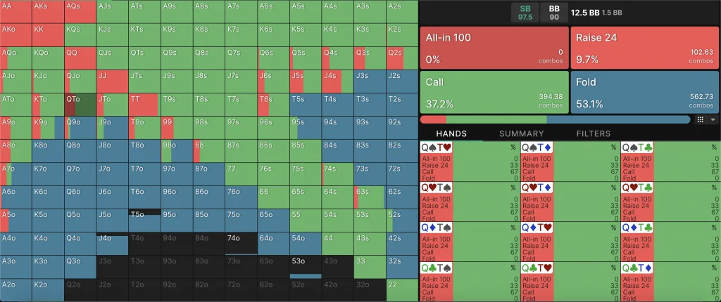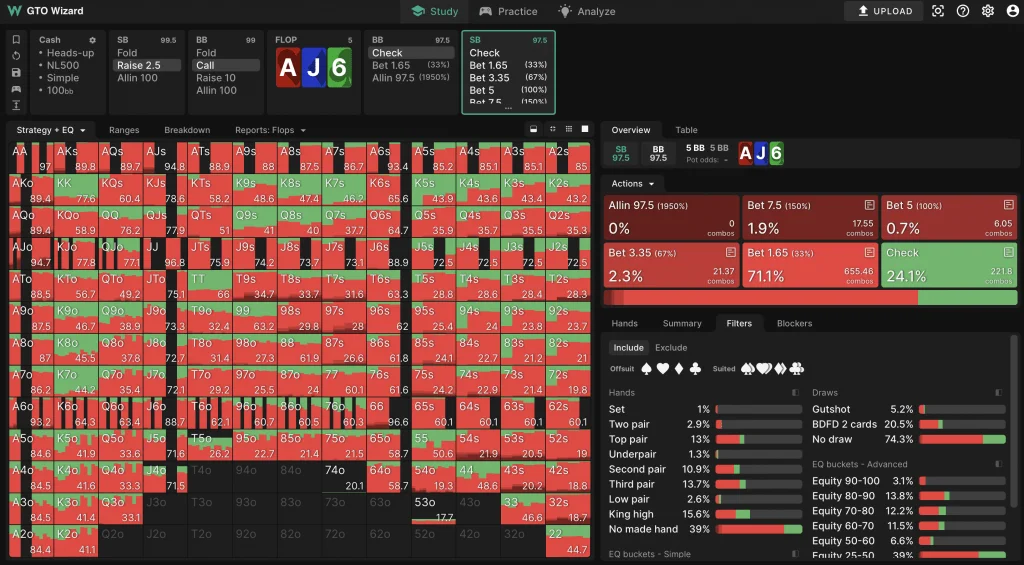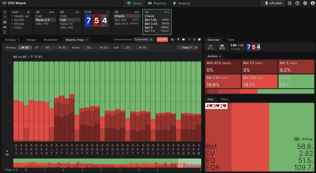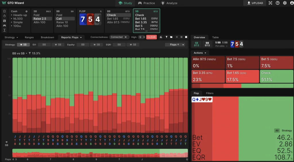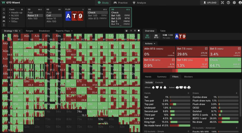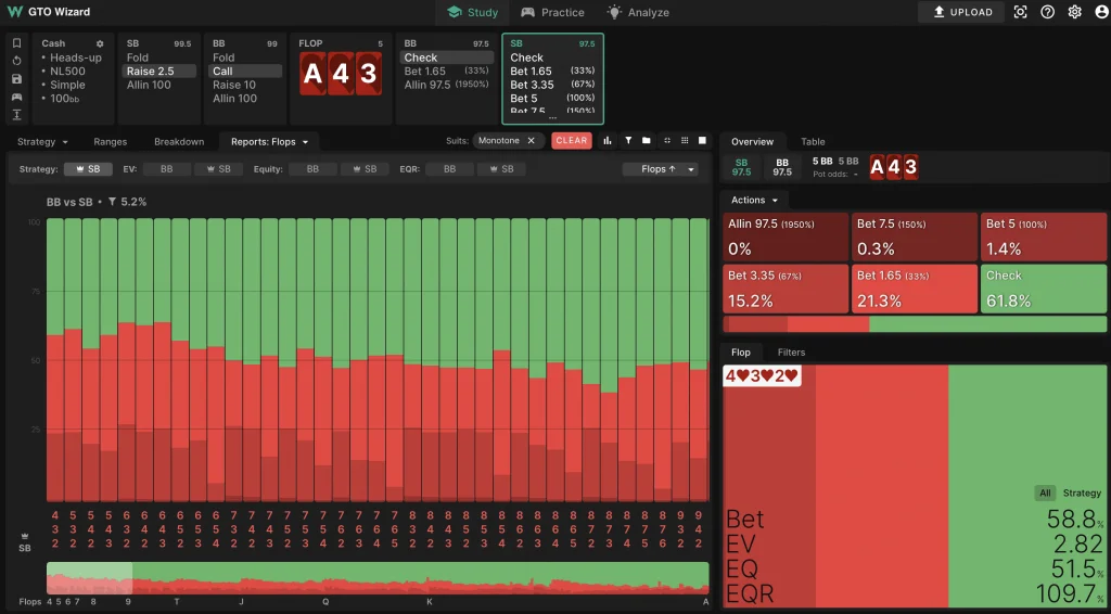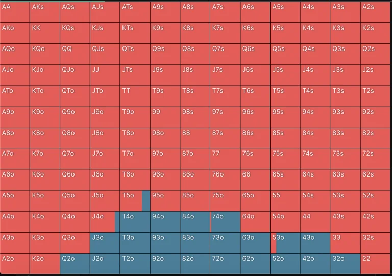 24 Aug 2024 GTO heads-up ranges Heads-up poker differs significantly from the strategies used in a 6-max table. To become strong in heads-up pla you need to study specifically for it. But many players don’t prepare intentionally for heads-up. So if you know how to play heads-up in more detail, you can gain a big advantage over the field. In this article, we'll explore how to effectively approach heads-up situations. What is Heads-Up? If you're reading this article you probably already know what a Heads-Up (HU) is, but just to be sure, let's review what it is. Heads-up refers to a poker game where only two players are involved. This can happen at a 6-max table where four players fold, or in scenarios where the game starts with just two players. For this article, we define heads-up as a game starting with only two players at the table. Heads-Up Rules Before diving into strategy, let’s quickly review the rules. In heads-up play, the Button (BTN) and Small Blind (SB) are the same player. The cards are dealt starting with the Big Blind (BB) and ending with the SB. This may confuse some, as in other formats, the SB is dealt first. The action begins with the BTN (SB). Heads-Up Strategy To effectively play heads-up, focus on these three key aspects: Play aggressively Consider wide ranges Exploit your opponent’s tendencies Play Aggressively Heads-up play is far more aggressive compared to 6-max and full-ring formats. Players accustomed to 6-max might be surprised by the level of aggression involved in HU. In heads-up, the SB and BTN are the same. Normally the SB is out of position (OOP), but in heads-up, the SB is in position (IP), so he can try to steal blinds with a very wide range. This chart is the SB's opening range at 2.5bb (5% rake, 0.3bb CAP). It shows that you can open almost all cards except T4o-, 74o-, J3o-, 43o-, Q2o, 32o. In particular, you can open all suited cards. The SB can open-raise with around 80% of hands in a HU. This chart shows how the BB should defend against the SB's 2.5bb open. You can defend 63.6% of the time. Out of those, 6.5% should be with a 3-bet. It's surprising to see that the 3-betting range includes Q8o, 93s and T4s. The SB's defense against this BB 3bet (SB: 2.5bb open, BB: 10bb 3-bet) is also wide. QTo should 4-bet 33% of the time, and J4s — 62.6% of the time. Consider Wide Ranges Given that the BB defends against the SB’s open 63.6% of the time, the ranges post-flop are extremely wide. Let’s look at an example: You're in the SB with Q♣9♠ and open for 2.5bb, and the BB calls. The flop comes 8♠6♥4♦︎. BB checks, SB? In such a situation, both players’ ranges are wide, leading to a variety of possible actions. The flexibility of options is reflected in the complexity of range charts. Exploit Opponents Unlike 6-max tables, where you may not often face the same opponent, heads-up play involves continuous confrontation with the same player. Also, as mentioned earlier, in heads-up, you play with a wide ranges, so you can quickly identify and exploit your opponent's tendencies. For example, 6-max players who aren't familiar with heads-up may have narrower 3-bet or 4-bet ranges. If you see a 3-bet or 4-bet from such an opponent, you can be sure they have a stronger range than what a solver suggests. In this way, by adopting a more exploitative strategy in heads-up poker, you can increase your win rate. Heads-Up Flop Strategy For this guide, we will focus on heads-up strategies for 100bb cash games with SRP, using GTO Wizard for assistance. The stack sizes or formats might be different (like MTT or Spin&Go), but the methods introduced here will be very helpful for analyzing other formats. The goal of GTO poker is to create a strategy that is hard to exploit, not to create the strategy with the highest EV. In practice, opponents often deviate from GTO. It is important to make the most profit from these deviations. The strategies introduced here will help you find these deviations. First, check the overall frequencies. While these frequencies alone might not be very useful, but it will give you an idea of whether it's above or below average. As a general rule: The more nut advantage you have, the larger the bet size will be, and the greater the equity advantage the more frequently you will bet. The ranges for BTN (SB) and BB are as follows: BTN (SB) range BB range You can get these pre-flop ranges for free in GTO Wizard. If you're interested, you can sign up to check them out. Special Boards Monotone and paired boards are treated as special boards. On these board textures, large sizes are rarely used. Monotone Board Paired Board On monotone boards, the check frequency is 61.8%, the 33% of the pot bet — 21.3%, and the 67% of the pot — 15.2%. Since there is often no nut advantage and equity is close on these flops, overbet is a rare option. Even with small bet sizes, the betting frequency decreases. On paired boards, the check frequency is 32.9%, the 33% bet — 60.2%, and the 67% bet — 6.2%. Even though there is no nut advantage, there is a significant equity advantage. Paired boards let you maintain the pre-flop advantage, so the frequency of small bets increases. Boards with a Straight On straight boards (like 754 or QT8) overbets are rarely used. However, unlike the two board types mentioned above, 100% and 66% bets become more often. All straight flops Except for A-high and K-high straight flops On straight boards, the check frequency is 52%, the 33% bet is 16.1%, the 67% bet is 19.8%, the 100% size is 9.2%, and the 150% size is 3%. Overall, the 150% size is used quite often. However, many of these cases are on high card flops (like AJT or KQT) where overbets are frequently used. When excluding A-high and K-high flops, the check frequency is 51.1%, the 33% bet is 17.5%, the 67% bet is 23%, the 100% size is 7.5%, and the 150% size is 1%. A-High Boards A-high boards are divided into six types: A-H-H (Ace-High-High) A-H-M (Ace-High-Mid) A-