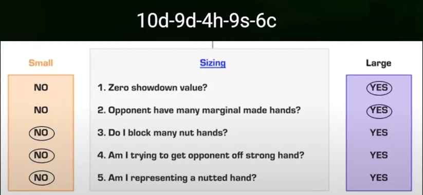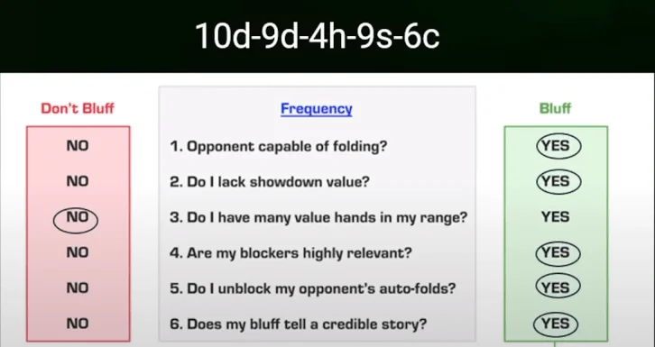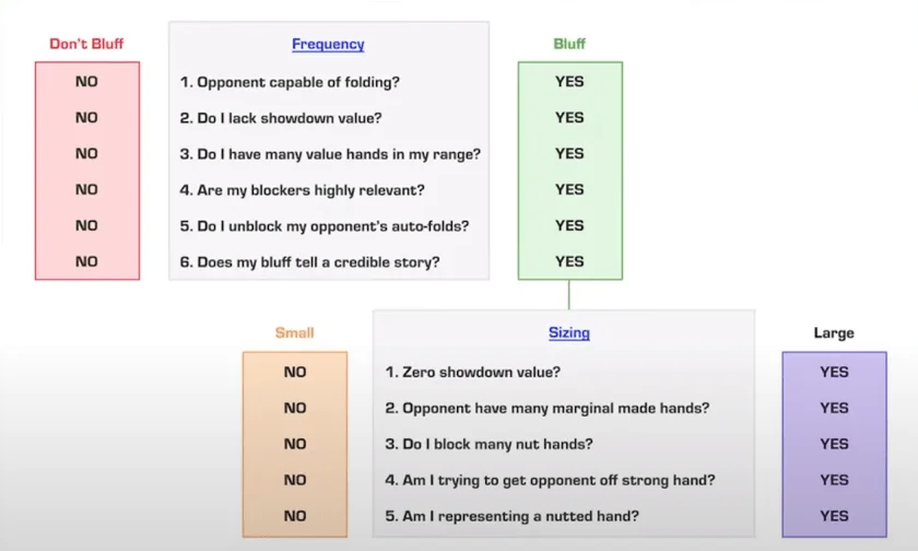 23 May 2024 barreling blockers bluff red line semi-bluff Bluffing is the first association that we have when we hear about poker. But what is much more important is that this is its integral component, from which you can either earn a lot of additional profit, or, conversely, lose even more if it is used incorrectly. Recently, well-known coach and current high-stakes professional Jonathan "JcardShark" Little shared valuable tips on how and under what conditions bluffing will bring you positive EV or very negative EV, so that you stop bluffing altogether. If you don't want to read the whole article, then you can limit yourself to studying the flowcharts. Even with a basic understanding of the terms and concepts, this will be more than enough to learn the foundation for new techniques or refresh what is already familiar, but slightly forgotten. If, for some reason, you don't know exactly the difference between bluffing and value-betting, we recommend you read this article: What is the Real Difference between Value and Bluffs? The following text is in the words of this famous professional player. People often write to me on social networks asking me to release more content on the topic of bluffs, because many do not understand where and how to apply pressure in order to win a pot without a strong combination. Well, today we will dive into the topic of bluffing. You will receive 2 specific flowcharts with detailed explanations and a specific example of deciding to bluff and choosing its bet size. Introduction If you just want to wait for a good combination and to constantly cooler your opponents for a lot of chips/money, then here is my advice - stop doing this. At best, you will be a barely profitable player over the long run. Even at low stakes, where there are a lot of fish, if you practically do not bluff, then you will be paid worse with each new session. Even many fish get burned, remember you and no longer want to play without a big hand. And if you want to win a lot at poker, you need to learn how to bluff in a timely and effective manner Before we get to the main point, I need to give you 3 key terms that will come up frequently as you read the article. Autocalls are hands that your opponent will call without hesitation and almost never fold. These are objective nuts, TPTK in low SPR and other hands that will not fold at all or extremely rarely. Autofolds are hands that your opponent won't even think about calling and will fold very easily. These could be missed draws, bottom pairs, middle pairs in a huge pot and/or on a board where everything has hit/completed, etc. Blockers are specific cards in the two that you were dealt (holecards) that reduce the likelihood of your opponent having a certain hand or even make it impossible to have it. For example, when you have A♦️ in your hand, then on a board with X♦️X♦️X♦️ no opponent can have a flush with such an ace - that is, a nut flush. And when an opponent knows how to think, this will greatly influence his decisions in a huge pot. In addition, due to the fact that the largest group of flush draws even preflop is formed from suited hands with 'A', when you have the corresponding ace, you block a significant proportion of flushes in general. Typically, having an Ace of the same suit as 2-3 cards on the board will reduce the number of flush draws and flushes by more than a full 1/3 of all such hands. Namely, they would be auto-calls on a 3-flush board. How to decide - should you bluff or not? In other words it can be called bluff frequency. Here is a chart of your decisions about whether it is advisable to bluff and what size to bet, if so. We will go through it point by point - from top to bottom, explaining everything in detail. There are 2 blocks in the scheme: bluff frequency and bet size if you decide to bluff. Here we will evaluate whether it is advisable to bluff in the current spot or not. These questions need to be asked on every street, and especially on the river. Now let's go through the questions. #1. Is your opponent able to fold? Will he fold the bottom pair? If he is more likely to fold it, as well as A-high, then you can consider a bluff. If not, then you shouldn't bluff. #2. Do you lack showdown value (SDV)? Would it be difficult to win with your hand by checking the river? For example, you have some kind of pair, but the board is not very coordinated and has no completed straights or flushes, then you almost always have some kind of SDV. Then you shouldn't consider a bluff. But when you bet and bet with a straight draw, and on the river after the draw busted, you just have a 6-high hand (63s, for example), which will always lose when checked, then this is a good reason to think about bluff. #3. Do you have many value hands in your range? Are there many strong hands that immediately come to mind that you would play in the same manner? If there are many such hands - lean towards the bluff because it will be plausible. If there are just few such hands, you shouldn't bluff. #4. Are your blockers highly relevant in this spot? For example, as already described in the example above, A♠️ on a board with three spade cards will be an extremely relevant blocker. K♠️ will also be an important card that blocks all flushes with 'K' - namely, they come next to Ace-flushes in terms of the number of combinations. Good blocker - lean toward bluffing. Bad blocker - slow down. An example of terrible blockers - you have 9♦️8♦️ on the board A♣️K♣️Q♣️7♠️2♥️. - Your cards do not block any of your opponent’s value hands and other autocalls: neither X♣️, nor 'A', nor 'K'. This means that in this case he has the full number of combinations with the 2nd pair and everything that can be stronger. Then, obviously, there's no point in bluffing, even though you don't have any showdown value - especially when you've been playing passively the entire hand. #5. Do you unblock your opponent's autof