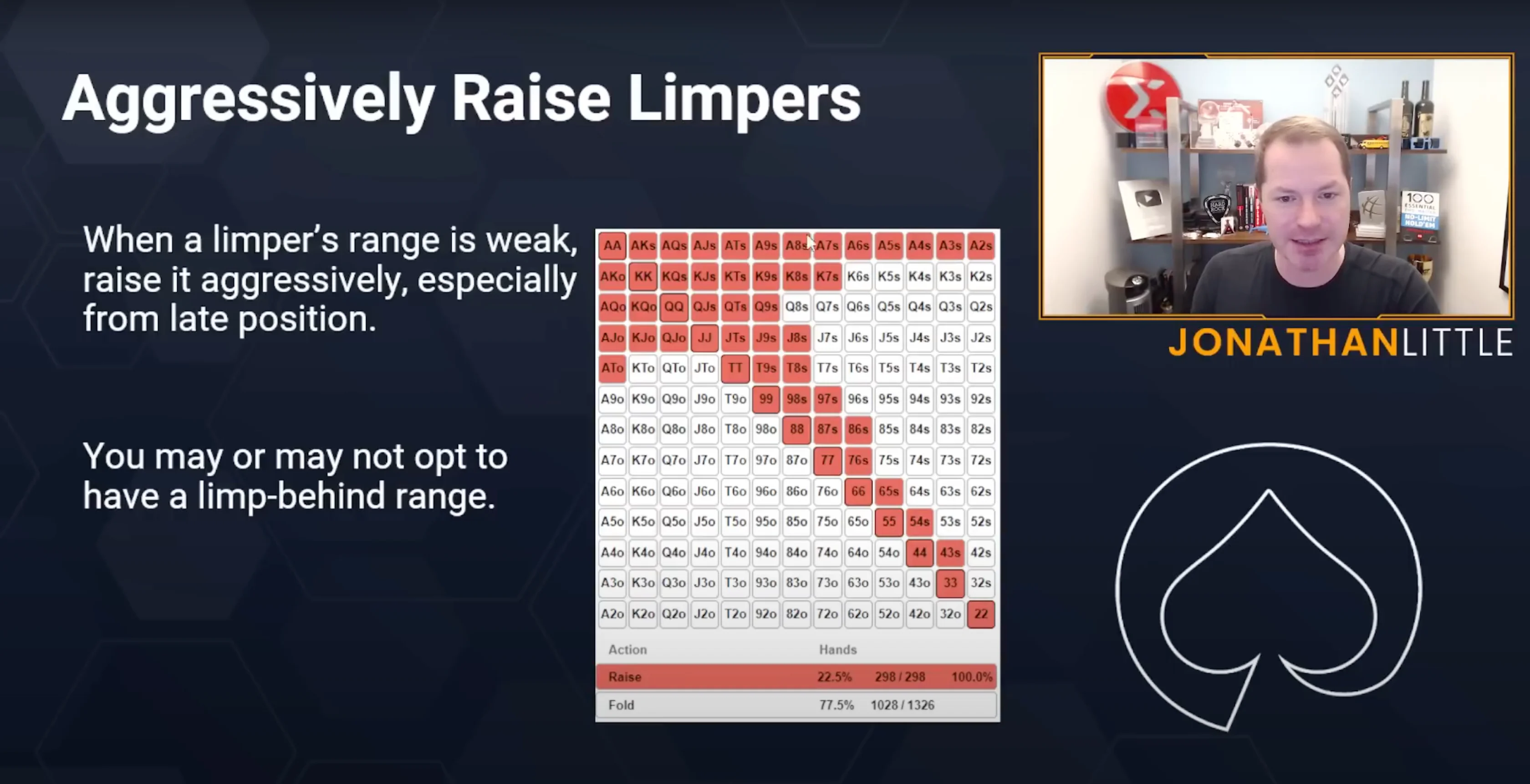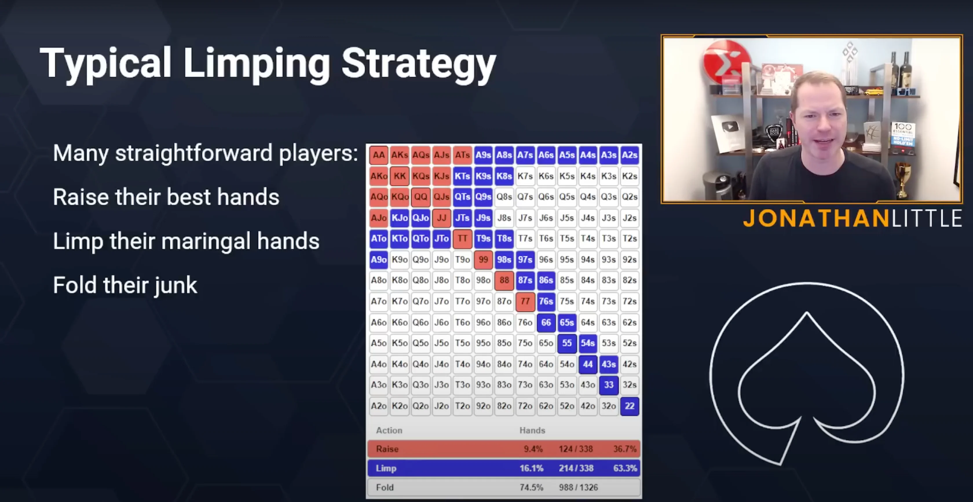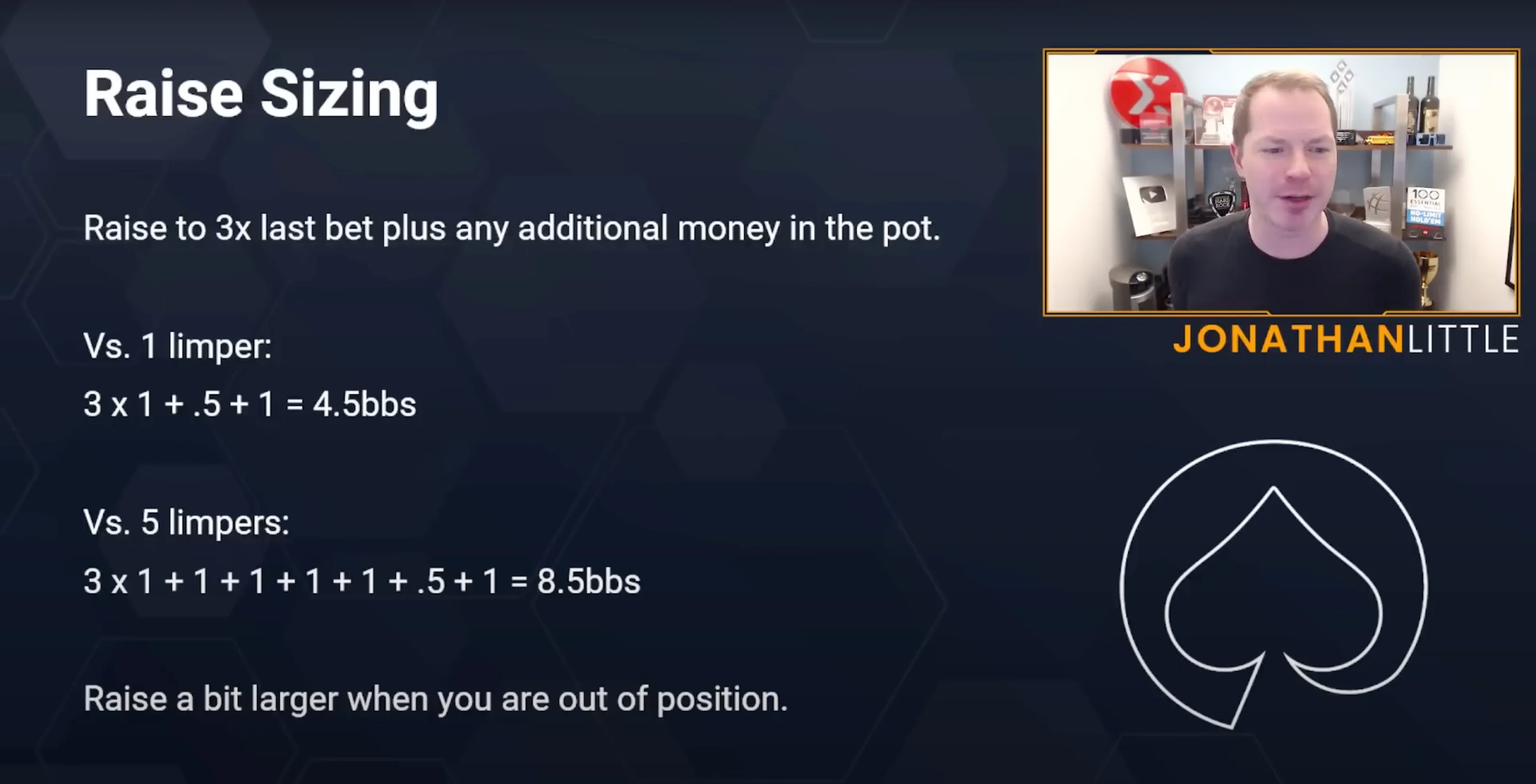 20 May 2024 A-game bet sizing limp moving up stakes multi-way pot pot odds When you play small or medium stakes poker cash games or tournaments, it's very likely that some of your opponents are going to limp in, just calling the big blind with all sorts of junk. These players limp because they have a hand that they think is okay but not quite good enough to raise. So, you might ask, what can I do about this? Well, if your opponents are going to raise all of their good hands and limp with all their medium-strength hands, that makes their limping range very weak. Depending on exactly what they think is okay, some people will limp with hands like King-10 suited, which is pretty good, whereas other players will limp with hands like 9-4 suited or 7-5 offsuit. Either way, you can crush these players by applying aggression with a range of hands that does well against their limping and calling range. And on top of that, if they're going to fold way too often after they limp, you can absolutely run them over because their limp essentially says: "Steal this pot from me". #1: Define what type of limper they are There are primarily two types of limpers: 1. Straightforward limpers: These are players who limp with decent hands that they think are not quite good enough to raise. This is just your stereotypical limper, and that's what we're going to be discussing how to exploit today; 2. Tricky limpers: They will limp with some amount of premium hands. These players may limp with some marginal hands, but they'll also limp with hands like Aces, Kings, and Ace-Kings, looking to limp and then reraise if someone raises. Against these players, you have to be way more cautious raising, especially with hands that really want to see the flop, like suited Aces, pairs, suited connectors, etc. #2: Aggressively Raise Limpers We're going to be discussing how to combat a typical straightforward limper. This is roughly what most straightforward limpers will do, some iteration of this: Raising: Pocket sevens and better, Ace-ten suited and better, Ace-jack offsuit and better, King-jack suited and better, King-queen offsuit, and Queen-jack suited; Limping: Pocket sixes and lower, other suited Aces, some suited high cards, some suited connectors and gappers, and some offsuit high card hands. This is pretty normal for a lot of people who limp a decent amount of the time. Recognize that some players will limp with far more hands. They’ll limp with hands like King-four suited, Ten-six suited, Seven-four suited, Nine-eight offsuit, Ace-eight-six offsuit, etc. If they're going to be limping with really junky ranges, then that's going to make the advice here even more applicable. As your opponent limps with just junk, you can raise with decent hands and absolutely crush them. However, I do not recommend raising with a very wide range of any two cards because you still have to worry about other players remaining in the pot. A lot of the time, the limpers are limping with hands they don't plan to fold to a raise, which means you are going to have to go to the flop, and you don't want to be playing terrible hands after the flop. So, what I would generally recommend is considering what the limper's range looks like for their medium-strength hands and then raise with all those hands plus all the better hands. Perhaps you can get even a little bit wider if you feel inclined because the bottom portion of your raising range, while it is going to be behind their limping and calling range, it's going to be fine because your range overall contains Aces, Kings, Queens, Jacks, Tens, Ace-King, Ace-Queen, etc., and those hands are going to crush the limpers. When a limpers’ range is weak, raise it agressively — especially from late position. Now, again, you may want to be a little bit tighter or a little bit looser depending on your opponent's post-flop strategy, but something like this will be fine. Also, you may or may not opt to have a limp behind range as your opponent gets more tricky and you think they're going to limp reraise you sometimes. You really don't want to raise a hand like pocket fives and then get limp-reraised. That would actually be quite bad because you don't want to limp, have the limper limp or limp-reraise, and then you make it. Let's say four and a half big blinds, and then the limper makes it 18 big blinds. Now I have to fold pocket fives. It would have been perfectly happy seeing the flop and trying to make a set. That would be really bad. So, as your opponent's going to re-raise you more, the hands with the best implied odds, mainly small pairs and some suited connectors and some suited aces, these hands really, really, really want to see the flop. So, as you can get limp-re-raised more, raise those hands less often. But until you think you're going to be getting limp re-raised some portion of the time, I would just raise everything you plan to play because that's going to result in the pot being heads up most of the time with you having a range advantage and a nut advantage over the limper, which is a really good spot to be in. #3: Use Proper Raise Sizes Let's talk about raise sizing. How much should you make it over the limper? Well, you're going to want to make it three times the last bet plus any additional money in the pot. In most scenarios, that is a pot-size raise. So, versus one limper, three times the last bet, which was the opponent's limp, plus the small blind and the big blind. So, 3 times 1 is 3, plus 5 plus 1 is 4.5 big blinds. So, if you're playing 2/5 No-Limit Hold'em and there's one limper, you're going to want to make it something like $20 or $25. I usually err a little bit bigger in cash games and a little bit smaller in tournaments. So, if we were playing a tournament with that same blind, I'd make it $20, and in a cash game, I'd probably make it $25. But it's not that big of a deal. What you don't want to do is make it $15 over the limper because then the limper should call you with ever