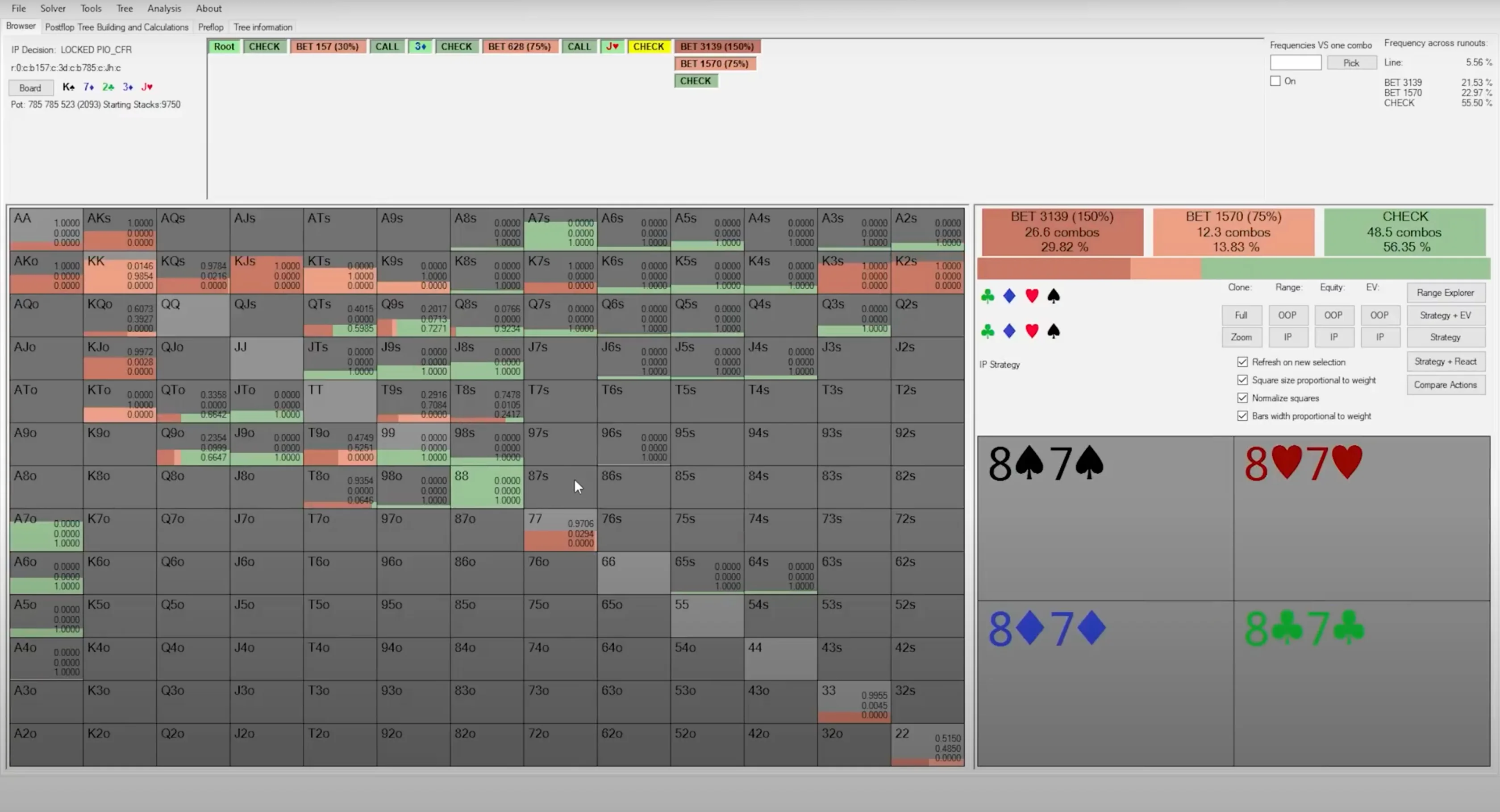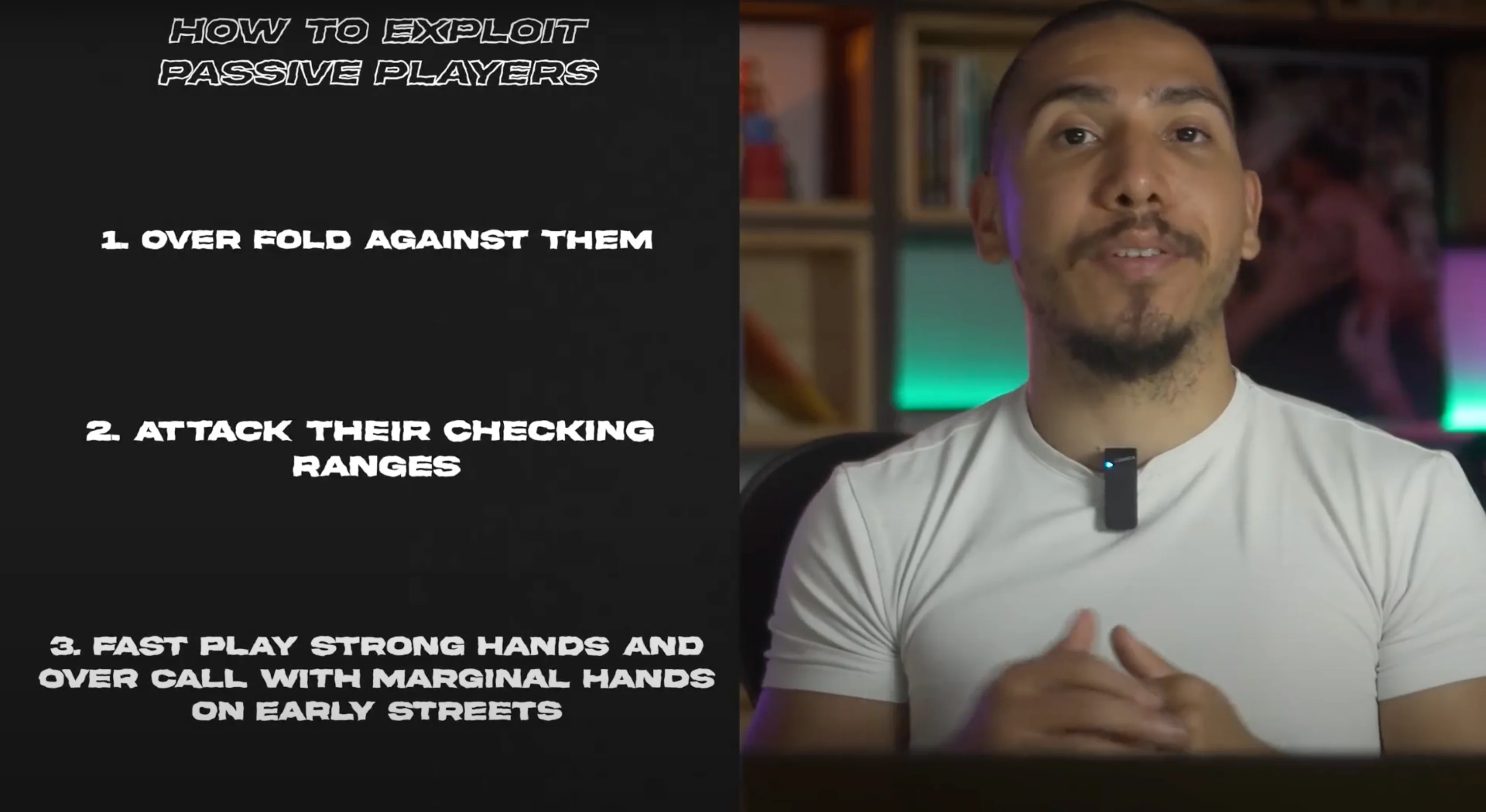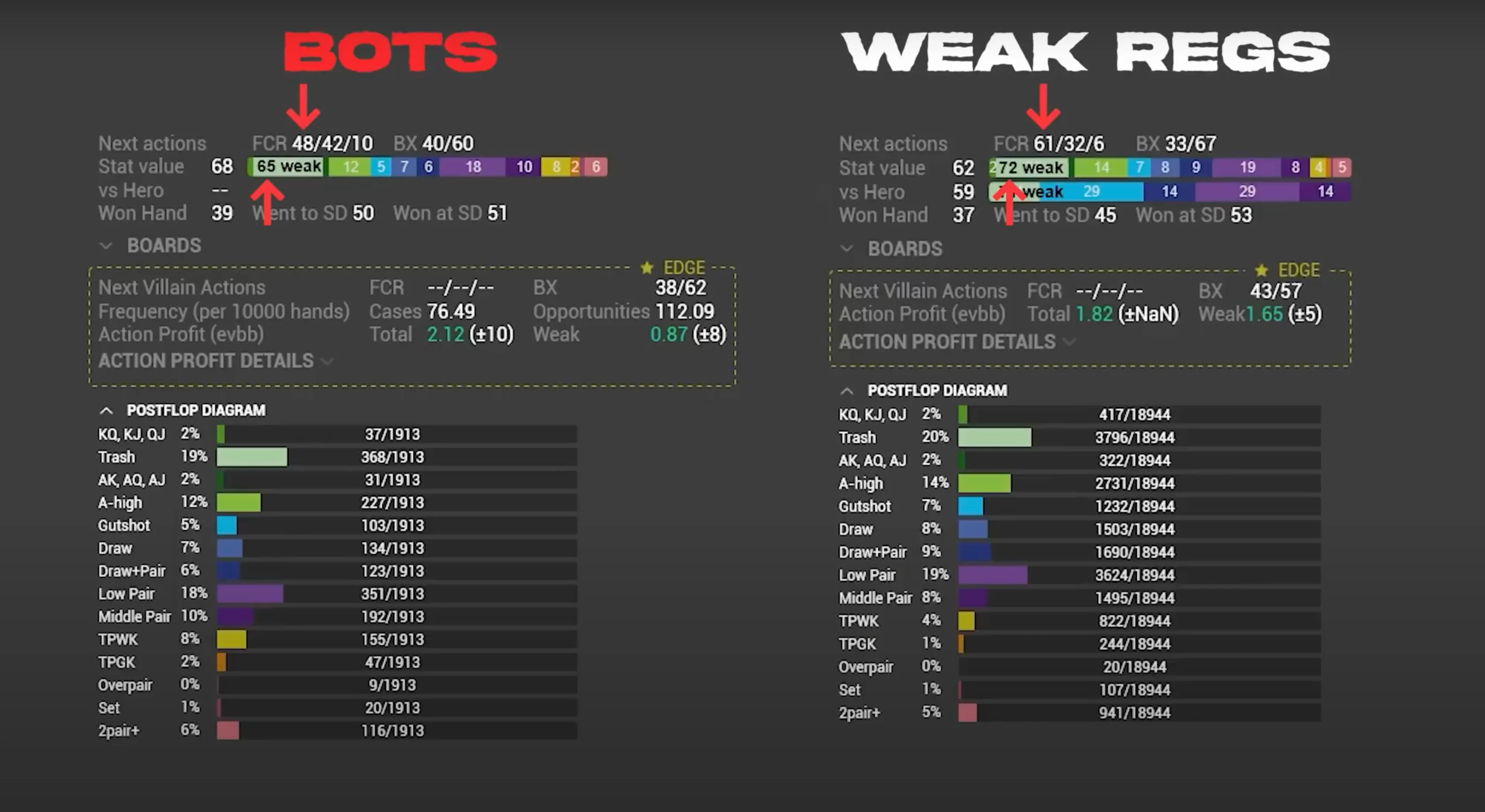 10 Jul 2024 exploit moving up stakes ranges Passive players make lots of mistakes playing poker, and the most recognizable one is their perceived inability to bluff enough. Because of this perceived leak, most people assume that the proper way of exploiting passive players is by over-folding against them. They see a passive player putting money into the pot and just snap fold their hand without much thought. However, this is not the way to maximally exploit passive players. What may seem obvious at first, just fold against them, is only the tiny tip of the iceberg. There's much more you can do to exploit them. After spending years studying with solvers to understand optimal behavior, thousands of hours analyzing population tendencies to understand human leaks, and developing my own automatic node lock-in software to study max exploit strategies, I've developed what I call the "Three Levels of Exploitation Framework." In this material, I'll apply this framework to the context of exploiting passive players and show you how much more money you can make against them. So, let’s go! The First Target — Action Level of Exploitation The first level of exploitation is the level that 99% of poker players operate at. It’s probably the level you operate at right now, and it's the level I mentioned at the beginning of this material. This level is the "Exploiting the Target Action" level. At this level, all you care about is adjusting your poker strategy after the target action from your opponent. The simplest example is when you over-fold against someone you think is under-bluffing. You adjust the part of your strategy that comes after your opponent's action of betting. It is, in fact, true that if your opponent is under-bluffing, the correct response is to start folding many hands you would previously call with. This is particularly relevant on the river, where if your opponent fails to reach the necessary amount of bluffs to make your bluff-catchers indifferent, you should respond by folding all of them. This will happen quite frequently against the more passive regulars in your pool. For example, take a look at the bet-bet-bet line range composition for regulars with a won-at-showdown (WSD) percentage lower than 47%. We can see that for the 75% bet sizing, they have, on average, only 23% of bluffs. When someone bets 75% pot into you, they're laying you pot odds of 30%, which means they need to be bluffing 30% of the time so that your bluff-catchers can break even on a call. Since they're under-bluffing by 7%, all of your bluff-catchers are now negative EV investments. When we input such deviation into a node-locking program, the result is, not surprisingly, that you should fold all hands that can't ever be EV-neutral or chop with them. That being said, be careful with making extreme adjustments based on just your feelings about a particular player or action. Even passive players can end up over-bluffing certain lines due to their poor range construction. One classic example is the check-check-bet line when your opponent is the caller out of position. Let's say you open on the button and get called by the big blind. Your small c-bet gets called on the flop, the turn goes check-check, and then the villain bets the river into you. The same regular profile that we saw under-bluffing the triple-barrel line by 7% actually over-bluffs the 2/3 sizing by 8%. It’s the same player but different lines and different behavior. If you want to exploit passive players, go ahead and do it, but make sure you don't overgeneralize. You should still call those people down sometimes. The second level of exploitation goes a bit beyond what's obvious. It’s less about interpreting exactly what someone did and more about figuring out what that actually means from a broader perspective. In the context of bluffing the river, for example, constructing a balanced betting range requires betting the appropriate amount of bluffs to balance the amount of value bets you have. If you decide to bet for a pot size, for example, and you have 10 value combos, you need five combos of bluffs to be properly balanced. So, you go into the pool of your potential bluffs that you got to that particular scenario with and draw five combos to place into your betting range to make it balanced. The remaining bluffs go into your checking range. What happens when you check? Now, positions are reversed, and it's your opponent who decides on the proper bet sizing to utilize. Based on the amount of value bets he has, he will pick the necessary amount of bluffs to be balanced. You, on the other hand, will have to construct a properly balanced defense strategy against his bet. If you call too much facing a bet, your opponent can exploit you by never bluffing, and then he makes a lot of money with his value bets. If you instead fold too much facing a bet, your opponent can make money by over-bluffing against you, as your over-folding tendency is making his bluffs profitable. There are two ways someone can fold too much facing a bet. The first one is by folding with hands they're actually supposed to call. In theory, imagine you're in the big blind against the small blind, and you get to the river after the flop went check-check and you called a small turn bet. Against another river bet, it's pretty common for the defense strategy to include third and fourth pair type hands and even ace-highs. If you fold these hands that you're supposed to call, you'll likely be over-folding. The second way someone can fold too much is by having an excess of weak hands in their range. In the same situation, imagine now that you're the small blind. You bet the turn, but once you get called, you decide that your opponent is likely to call you too much on the river, so you end up giving up most of your bluffs, which your hands are supposed to bet sometimes. Now, when you check and face a bet, even if you call with the bluff catchers in your range, you will be folding t