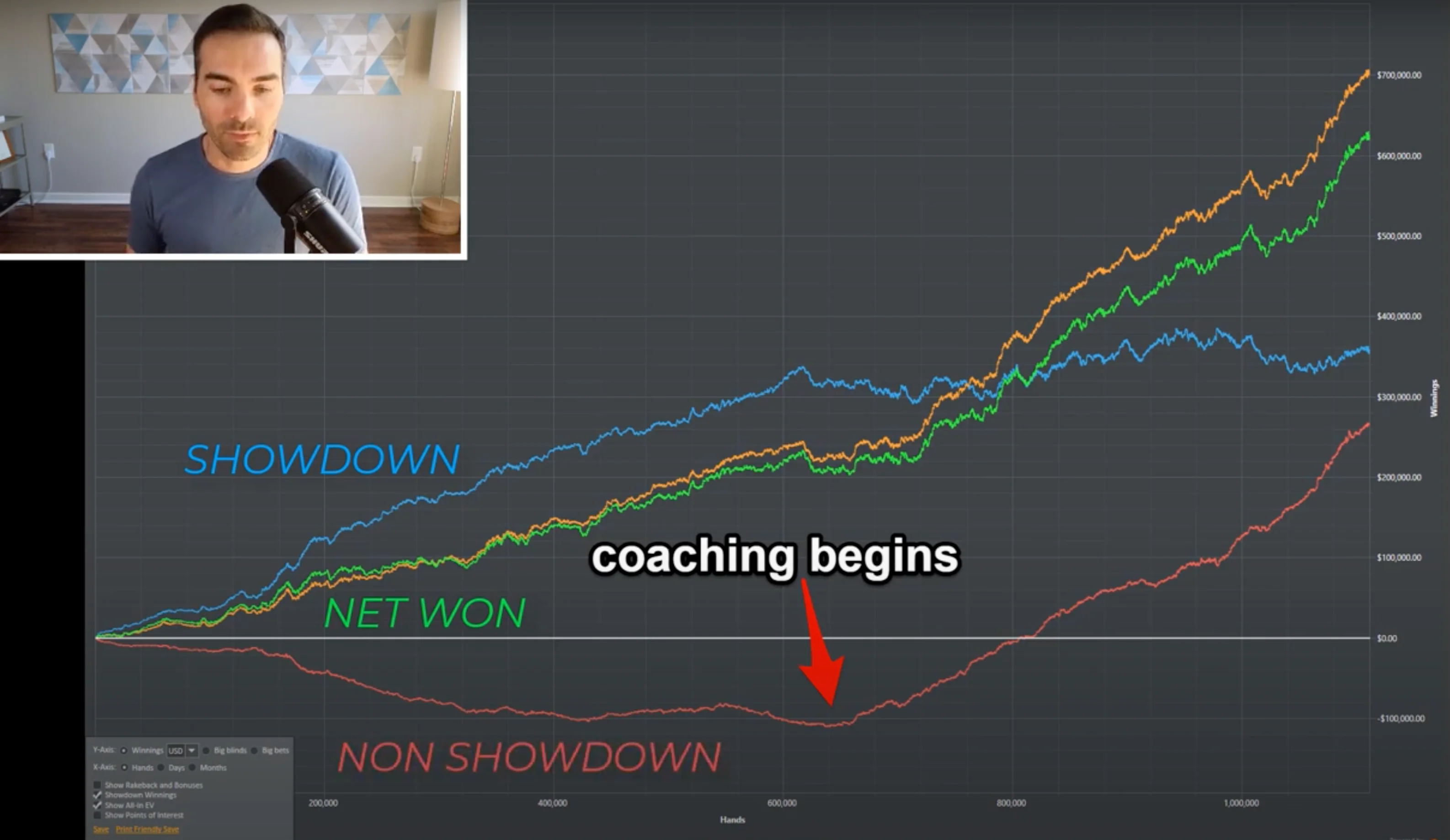 12 Aug 2024 bluff discipline moving up stakes red line value bet These days, it seems like everyone wants to know how to improve their red line — their non-showdown winnings. It's probably the number one question I get from prospective students: "Can you help me with my red line? It’s going straight down, and I don’t know what’s wrong with it". This issue is quite common, where you have a really losing red line and recognize that something’s off in your game, but you’re not sure how to fix it. That’s exactly what this article is about. Today, I’m going to share three unorthodox ways to improve your red line. This isn’t just about bluffing more or folding less on the river, although those are important. We’re going to go deeper because there’s a lot more to the red line that the poker community doesn’t fully understand, and I’m going to explore that with you today. Now, let’s dive into transforming your red line. Student Redline Transformation On the screen right now, I have an example of a student I coached who initially had a very losing red line. However, after applying some of my advice, his red line shifted in the complete opposite direction, turning into a winning one. If you're not familiar with how these graphs work, let me explain. When you play online poker using poker tracking software, the software keeps track of your winnings, which is what this graph represents. The green line shows your total winnings, but it’s also broken down into two additional lines. The blue line represents your showdown winnings — the amount you won when you had to reveal your hand at the end of the hand. The red line represents your non-showdown winnings — the amount you won without showing down your hand. There's also a fourth line on this graph, the orange or yellow line, which represents the all-in adjusted winnings. It's important to note that this graph spans over 1 million hands, so this is not just a fluke. The student genuinely transformed his game, and as a result, he added several big blinds per hundred hands to his win rate in the second half of the graph. If you’re looking for a poker coach, check out our section with the limits, prices and other options. The Green Line is What Really Matters Before I dive into how this student achieved their results, I want to emphasize that the green line — your win rate, your bottom line — is what really counts. The goal isn’t to boost your red line just to have a cool-looking graph. The ultimate objective is to win money, period. Now, if you were a solver playing against other solvers in six-max cash games, your red line would likely be negative, perhaps even very negative. In a balanced poker environment where everyone is playing optimally, you can expect a positive blue line (showdown winnings) and a negative red line (non-showdown winnings). But here’s the key: you’re not playing against solvers — you’re playing against humans. And humans, in general, tend to play too passively. They fold too much and don’t raise enough. The most common mistakes human players make are those of passivity, not over-aggression. So, if you’re in real games and have a very negative red line, it probably means you’re leaving money on the table. Alright, I won't keep you in suspense any longer. Here’s how you fix your red line: you have to stop being a nit. Just kidding — but seriously, you do need to play more aggressively. All the tips I’m about to give you will guide you toward playing more aggressively and less passively. If you have a really bad red line, you might not be a full-on nit, but you probably have tendencies that are too tight and too passive. You’ll need to fix those. Bluff More and Fold Less on the River The first real tip, which I’ll call tip number zero, is that you need to bluff more on the river and fold less in those situations. If you do that, your red line will leak less when you’re in bluff-catching spots, and you’ll win more when you’re the one bluffing. But I don’t want to focus too much on these two tips because everyone kind of knows that playing more aggressively on the river improves your red line. That's not particularly groundbreaking, and I don’t want to make articles about just basic stuff. So, here are three more tips. Be More Aggressive Preflop Let’s improve tip number one, which is probably the most common issue: you need to play more aggressively preflop. This is a problem many professional poker players face — they assume they’re playing preflop correctly but haven’t actually checked or studied their preflop game in a long time. Since preflop play is basic, they think they’ve mastered it and are too good to need further study. Don’t be that person. You really need to at least conduct a basic database review of your preflop play, especially if you’ve never done that before, because you’re probably playing too passively preflop without realizing it. The most common leaks include overfolding your big blind to steals, not three-betting enough, and also not four-betting enough. If you’re not three-betting enough, it’s going to really tank your red line. Just turning up the aggression preflop will likely change the shape of your graph significantly and help you stop leaking money preflop, improving your win rate as well. Call and Raise More on the Flop Tip number two: you’re probably overfolding on the flop and not raising enough. This follows the same concept as tip number one, but now we’re focusing on the flop. If you’re playing too passively, giving up too many pots on the flop, or simply not raising enough, it’s going to hurt your red line. This is particularly common when facing small continuation bet (C-bet) sizes, though players also overfold to larger C-bet sizes. As you likely know, the larger the bet size, the less you need to raise in theory, and the smaller your opponent’s bet size, the more you should raise. However, ma