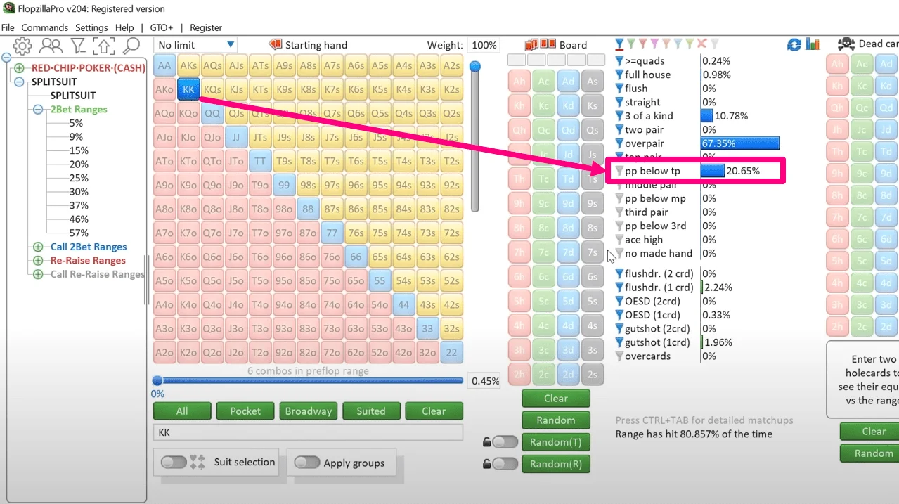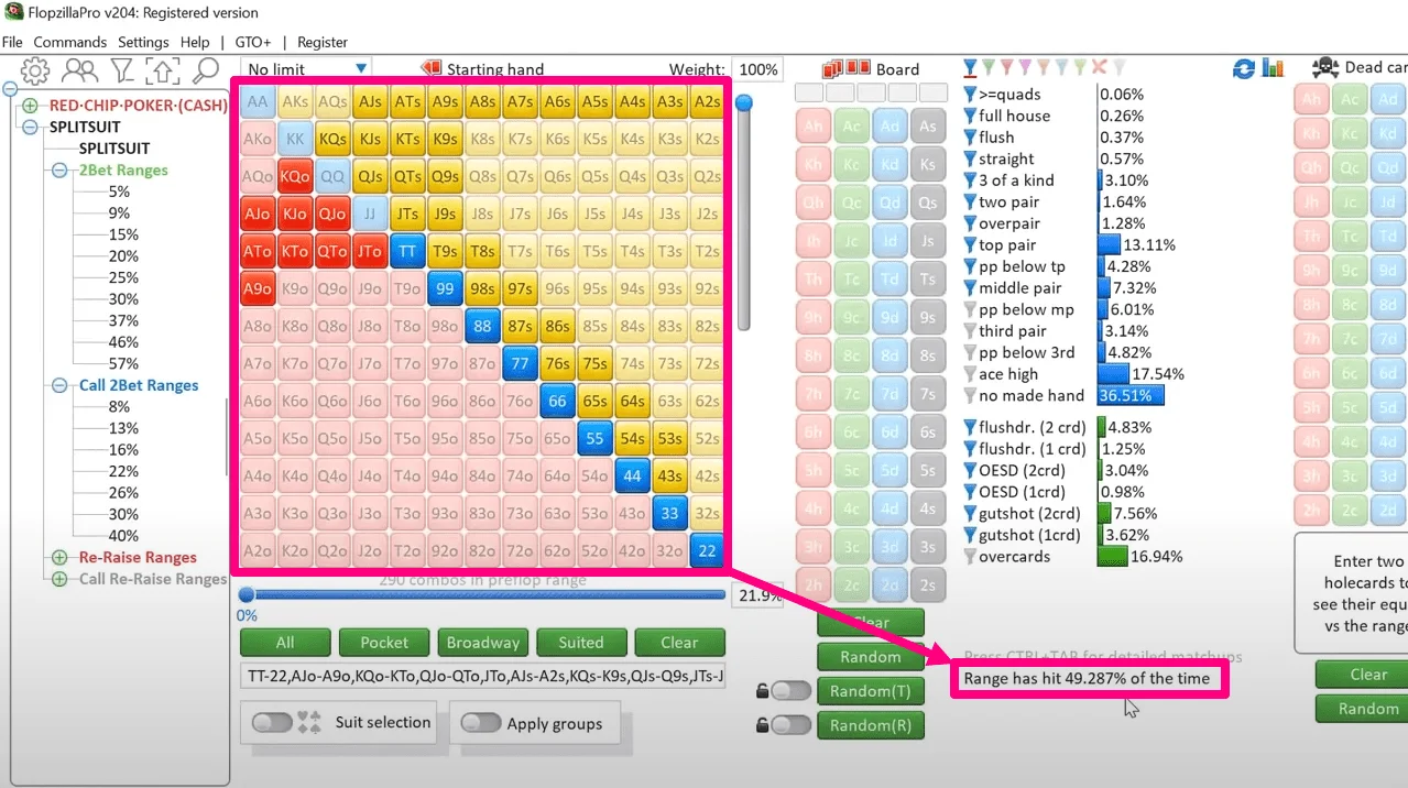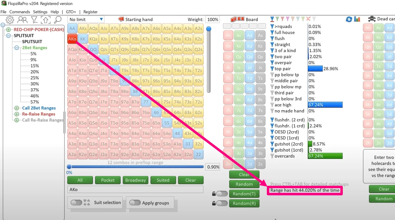 16 May 2024 discipline EV fold equity mindset probabilities Today’s article is not only for beginner poker players, but also for more or less experienced ones who begin to ask various global questions and wonder whether they are studying correctly and whether they have chosen the right path in life. James "SplitSuit" Sweeney is a renowned active midstakes player, coach and author of training videos and articles. He excels in both online and live poker, teaches others, and has extensive experience in choosing the right direction and focus for a poker career. The following text is in his words. Introduction If you want to play poker well and effectively, you will have to learn a lot and learn the right things. But when you are just starting out, or find yourself in prostration, not really understanding whether you are on the right path now, everything becomes much more difficult. When I first started playing poker in the early 2000s, the game was as different from today as heaven and earth, and you wouldn’t recognize the poker of those times if you were at the same table with us. In those early years, we did not yet have such things as solvers, and even the first equalizers were just beginning to appear. All we had was an exchange of experience and reading those few books that were written on strategies that were already outdated at that time and did not even need to be read. At the same time, the first poker sites began to appear. But no matter how the online poker world began to develop, it was still not clear: Where should I even start? What should I do after this and how will it affect me? What should I pay attention to and what will be important for my career? What should you immediately accept as an inevitable evil and try not to worry about it anymore? And many other questions ... If I had known at that time what I wanted to say today, many things would probably have been completely different. I've been playing poker for half my life - 18 years - and today I want to give you the 6 most important tips that I wish I knew at the beginning of my career, and that helped me go through difficult periods of the journey. Tip #1: How often hands hit vs miss Another way to call this is the hit and miss rates of different hands. This is especially useful in bluffs, because bluffs are the most common bets in poker, and when we talk about auto profit, we mean a bet whose actual fold equity is higher than that required for a given bet size. This is why it will be useful to understand how often your opponent's range hits a particular board or misses and, accordingly, folds. You should better understand 2 main things: How often do your bluffs have +EV. For example, if the actual opponent's range (who is only willing to continue with very strong hands) has few strong hits on the board, then he will fold extremely often, and thus you can print money on him without going to the point of comparing hands at showdown. Fold equity is huge, which means even small bets become very profitable. The same applies to pulling off bluffs in general. How often do your own hands hit/miss the boards. Then you have a sober and objective view of what you can do postflop. You also clearly understand that most starting hands miss flops or hit them very poorly. And therefore, a weak range can be bluffed very easily. On the other hand, you gain an understanding of your own overfolds. After all, if you keep folding postflop, putting money into the pot and then giving it up without a fight, then this is a sure way to a losing game. To learn to understand how different ranges hit and miss flops/turns/rivers, you can use different tools. But I consider FlopzillaPro to be the best - the most advanced poker calculator to date, which has a very convenient and demonstrative interface, simple operation for the user, and is also able to connect to the GTO+ solver for simultaneous work in both of these programs. Naturally, you need to use these poker programs between sessions: firstly, they simply will not calculate anything when a poker room process is detected, and secondly, sooner or later you will be banned from the poker room, because poker room client himself sees the running process of such software. This kind of software is prohibited. But let's move on to how FlopzillaPro helps you understand the hit (and miss) frequencies of different hands and even entire ranges. For example, let's see how the strongest unpaired starting hand (AK) hits the flop. How AKo hits the flop Here we will consider the hits of only its 12 off-suit variations. On the flop it will hit a pair (namely TPTK) 29% of the time. If we take into account hits in two pairs and stronger, then in total it comes out to 34.4% of cases, that is, a little more often than 1/3 of the time. - Still not often, right? - If you add here hits like gutshots, flush draws and OESD, then your favorite AK will still hit no more than 44% of the time, and strongly - still 1/3 of the time. The remaining 66% of the time, you will still have an A-high hand. So when you think that AK and other unpaired hands don't make pairs all the time - yes, that's exactly how poker works. How does KK hit the flop? Who wouldn't be happy to get two kings preflop? - But it’s not so simple with them either, because it’s still not two Aces. KK will only be 2nd pair overall 21% of the time - the Ace will come on board exactly 1/5 of the time, and you should be able to play your 2nd pair from KK when your opponent has a likely top pair. So the thought that the ace comes out with some unrealistic frequency is an illusion, and you just need to be prepared for its appearance on the flop. Example: How a certain range of hands hits the flop And now the task is more complex: look at how strongly and often a given range hits the flop, and how you can take advantage of it. We opened preflop and our opponent called. Here's his calling range and how he hits all flops on average. If we assume (by placing col
