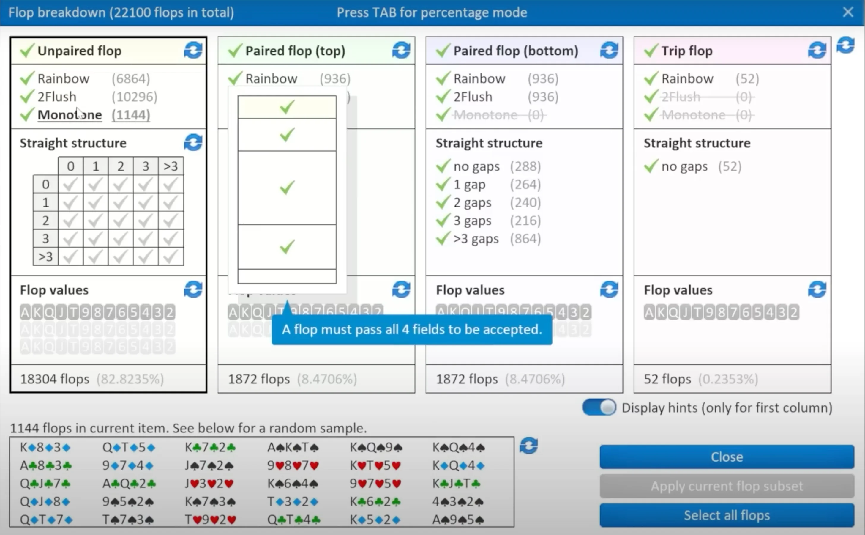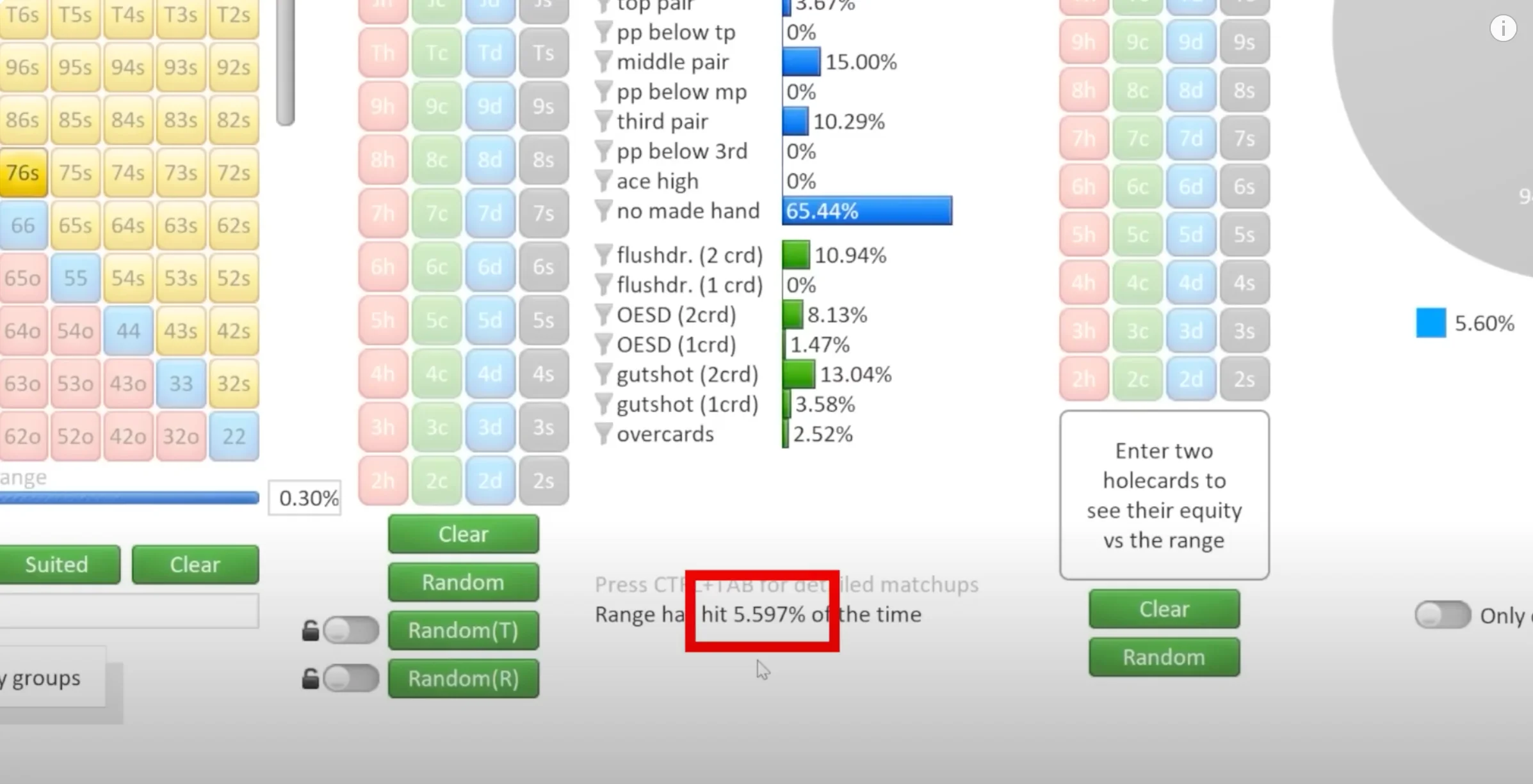 25 Mar 2024 flop HUD moving up stakes position pot odds If you're new to poker, you might be wondering: What are the odds of certain things happening? Like, what are the odds of getting dealt aces preflop? What are the odds of getting dealt kings and someone else has aces? What are the odds of flopping a set? Or what are the odds of having pocket jacks and there's an overcard on the flop? In this topic, we're going to talk about the odds of all of these things happening — as well as many other things in poker. And don't worry, we're not going to turn this into a hardcore probabilities lesson. Instead, we'll just give you some raw numbers to work with and show you how to solve your own problems in case you have other questions going forward. Let’s begin! Understanding Preflop Odds So let's get into it. First of all, we’re going to break this article into two different sections. First, we're going to cover different probabilities and occurrences preflop, and then we'll do the same thing for postflop in the latter half of the topic. So, it's better to get started with preflop first. Alright, so starting with preflop, what are the odds of getting dealt certain things? Let's start first and foremost with pocket pairs. Let's just say, what is the probability of getting dealt pocket aces preflop? Well, that is going to happen roughly one in every 220 hands, and as such, 0.45 percent of the time, or just round it very nicely to about half a percent of the time you're going to get dealt aces or really any specific starting pocket pair. Now let's look at unpaired starting hands, and if we just say, okay, what's the probability of getting dealt ace king preflop, both offsuit and suited, that is going to happen about 1.2 percent of the time overall. If we're looking for a specific hand, let's just say ace king suited specifically, that's going to happen 0.3 percent of the time. Alright, for this next preflop probability, we're going to roll back two pocket pairs and say, okay, if we have a certain pocket pair preflop, what is the probability that somebody else has a pocket pair that's higher than it? The answer here is going to vary massively based upon how many players are in the hand. For instance, let's just say you have pocket kings and you're playing heads up, you and one opponent, there's a 5 percent chance that your opponent has aces in that spot. However, if you're playing 10 handed, there is a 4.4 percent chance that someone else at the table has aces. And while this number isn't exactly going to help your overall preflop strategy, it can be a little helpful as a mental reminder of the times you run kings and aces, how often that is or isn't going to happen. Yes, it sucks when it does, but knowing the overall probability of it happening can help you frame a cooler when it happens preflop. So, let's say you're playing 6-max, so it's you and 5 other players. You would use the 5 players column, look at the pocket pair you're interested in, look for the correlating cell, and find the probability of exactly one opponent having a higher pocket pair than yours. Exploring Postflop Odds Alright, so I think we've sufficiently covered preflop for the time being, now let's roll over to postflop probabilities. And to show you how to solve pretty much all of your postflop probability questions. We’re going to use the tool Flopzilla Pro, because it’s just perfect for our analysis. Analyzing Probabilities for Different Hand Types So one of the first questions that people are typically interested in is how often is my pocket pair going to flop a set or better? And to do that in Flopzilla, we can very easily just plug in any pocket pair right here in the overall hand matrix. And then over in the middle section, we can go and just select "three of a kind or better" and you notice right down here it tells us how often that is hitting, and that is happening at 12 percent of the time exactly. Just in case you're curious, it's the exact same whether you have pocket sevens or pocket deuces or pocket kings, it's all going to be the exact same 12 percent for again a set or better on the flop. But of course, you're not always going to have a pocket pair, and sometimes you're going to have an unpaired starting hand. So another common question is, okay, what if I have, say, Ace King, how often am I going to flop top pair or better? Oh, we can go right back to Flopzilla. We can plug in Ace King, both suited and offsuit. We can plug in the top pair or better right over here. Again, all of that is selected in blue. Everything else is deselected in gray. And we see that's happening roughly a third of the time. And you can break this down into just suited. You can look at just offsuit, or again, you can look at the merge of both, but that is how you would solve this answer. And again, about a third of the time Ace King is going to be flopping top pair or better. Alright, so that's all well and good for pocket pairs and strong starting hands like Ace King, but what about suited connectors? How often are they going to absolutely smash the flop? Well, once again, we can flip back over to Flopzilla Pro. We can plug in a suited connector. Let's just say seven, six suited. And let's just say we're going to say a smash is two pairs or better on the flop. So we see that that's happening a whopping 5.6 percent of the time. So not a tremendous amount. But you might also be curious to say, okay, when I have a suited connector, I really like not just smashing the flop, but I'm also going to continue a lot when I have flush draws or open-ended straight draws. You can also plug those in right here, so flush draw with two cards, open-ended straight draw with two cards. You can also say open-ended straight draw with a single card if you wanted as well. And you notice that overall that is hitting roughly 25 percent of the time. Dealing With Unfavorable Flop Outcomes Now there's another huge question that newer players tend to have