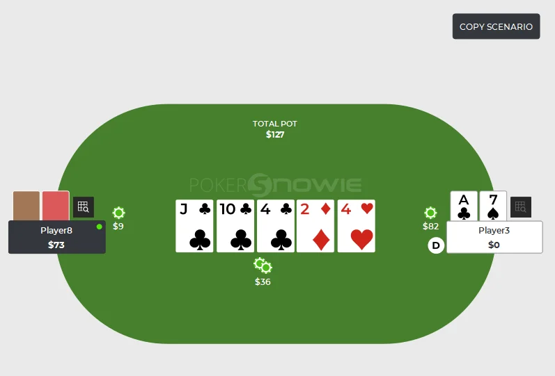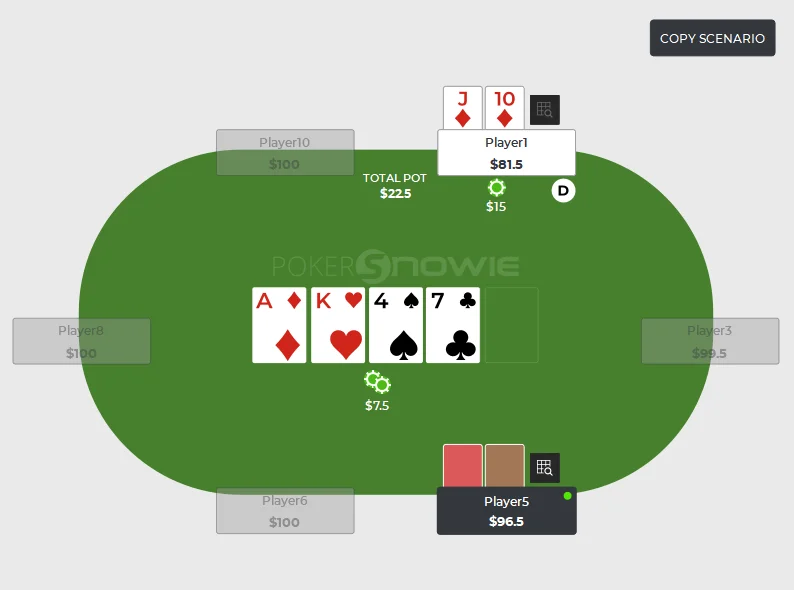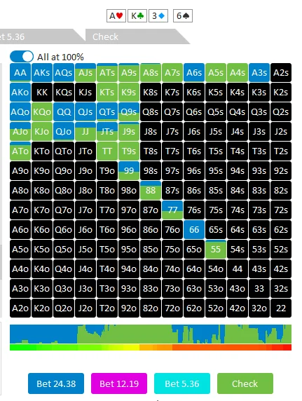 17 Aug 2024 bet sizing overbet ranges Do you regularly use overbetting in your game? Overbetting has become a powerful and popular strategy in recent years. Many old-school players, who are used to more 'standard' bet sizings, struggle to adapt to overbets. Some fold too often, while others call too frequently. Mastering overbetting can significantly boost your poker skills and results. What is an Overbet? An overbet is a bet that exceeds the size of the pot. Here are some examples: In this scenario, the pot is $7.5, and Player 1 makes a $15 bet. Since the bet size is greater than the pot, this is called an overbet. Another example: In this situation, the pot is $45 ($36 + $9), and Player3 makes an $82 raise. Since the size exceeds the pot, this $82 raise is an overbet. These examples illustrate what an overbet is. Now, let’s delve into the strategy behind overbetting. Why Overbet? Let's explore the key reasons why overbetting is such a powerful move: 1. To Extract Value The primary reason is to extract value. This may seem obvious, but many players miss out on value by making smaller bets, stuck with some imaginary limits in their heads Missing out on value means losing potential earnings. If your opponent is unlikely to fold, you should make overbets to maximize value. 2. To Deny Equity The second reason is to deny your opponent's equity. This is the most critical aspect of overbetting. When you make an overbet, your opponent's calling range narrows to very strong hands or bluff-catchers. Medium-strength hands often have to fold, burning their equity. 3. To Exploit Weaknesses The third reason is to exploit opponents. The vast majority of players react to overbets poorly. Particularly most players (including regs) have a tendency to overfold to large bets, making bluff overbets effective. Conditions for Effective Overbetting When considering overbetting, it's important to recognize specific conditions that make this strategy most effective. 1. Nut Advantage The first condition is having a nut advantage, meaning your range contains more strong hands than your opponent's. 2. Capped Opponent Range The second condition is when your opponent's range is capped, meaning they lack very strong hands and have more medium-strength hands. This makes it difficult for them to call overbets. 3. Blank Runouts The third condition is when a blank card falls on the board. After betting or raising in the previous round and getting called, if an brick card appears in the next round, your range still contains very strong hands, making overbets viable. Practical Example Let’s look at an example based on these conditions: Pre-flop: MP raises 3 bb BB calls 2 bb Flop (Pot: 6.5 bb): A♥K♣3♦ BB checks MP bets 4.88 bb (75%) BB calls Turn (Pot: 16.26 bb): 6♠ BB checks MP bets 24.38 bb (150%) Does the turn overbet from MP meet the conditions? Nut Advantage: MP's range includes AA, KK, 66, 33 sets, and strong hands like AK, A6, A3. BB’s range likely lacks these hands. Capped Opponent Range: BB called pre-flop and now has fewer strong hands, with most of their range being medium-strength. Blank Runout: The 6♠ does not complete any straights or flushes, fitting the blank runout condition. GTO analysis confirms MP's overbetting strategy here, indicating that MP should overbet with many hands, including bluffs like QJ or JTs. EV and Equity Overbetting situations often show higher EV for the overbetting player despite lower equity. In the above example: MP’s equity: 46.2% BB’s equity: 53.96% MP’s EV: 9.39 BB’s EV: 6.86 BB has higher equity but lower EV due to MP’s ability to bluff with draw hands, while BB must fold even some top pairs, unable to realize their equity. It should also be noted that there is no fixed size for an overbet. The more polarized your range, the larger your bet can be. Use overbets wisely to outplay your opponents!
