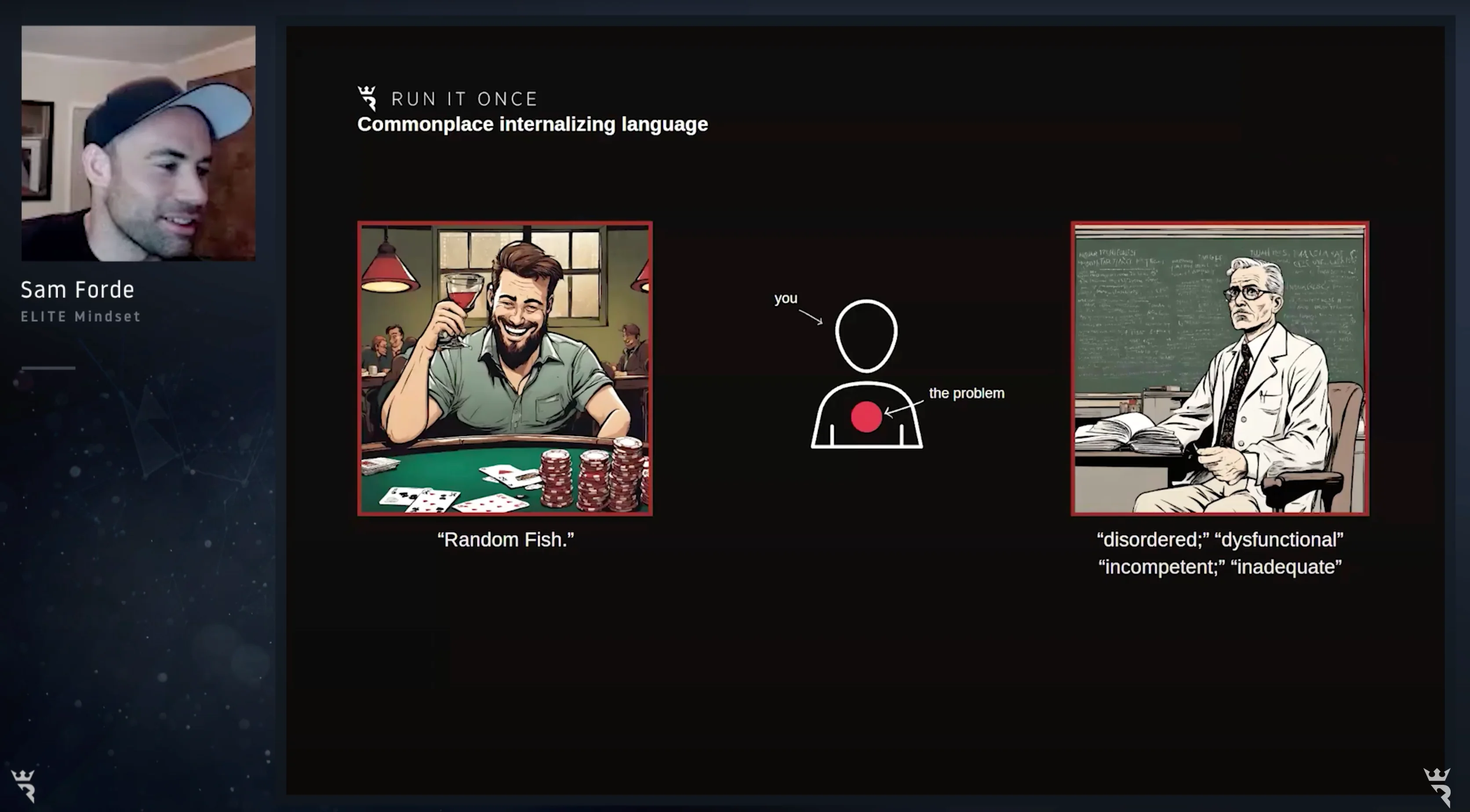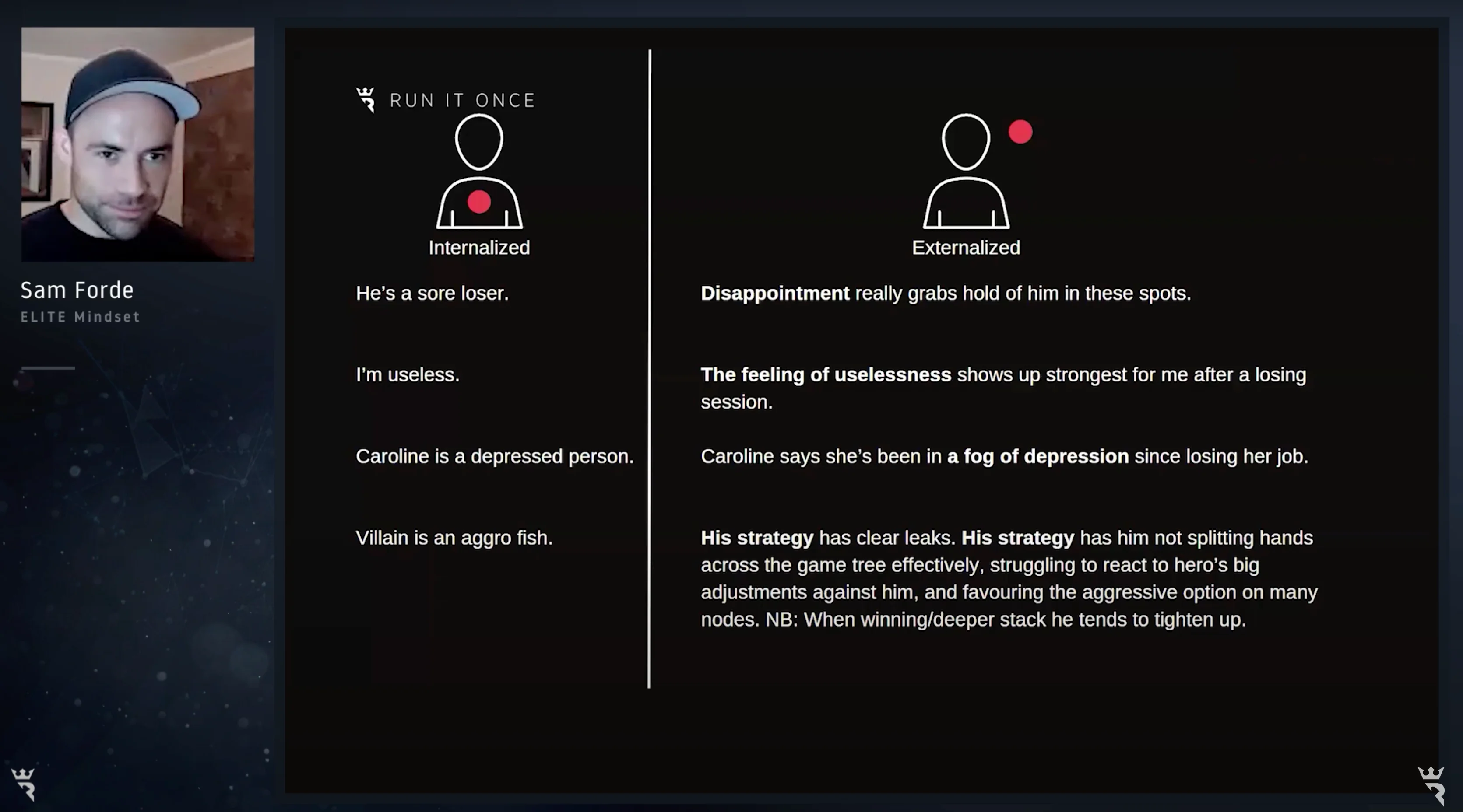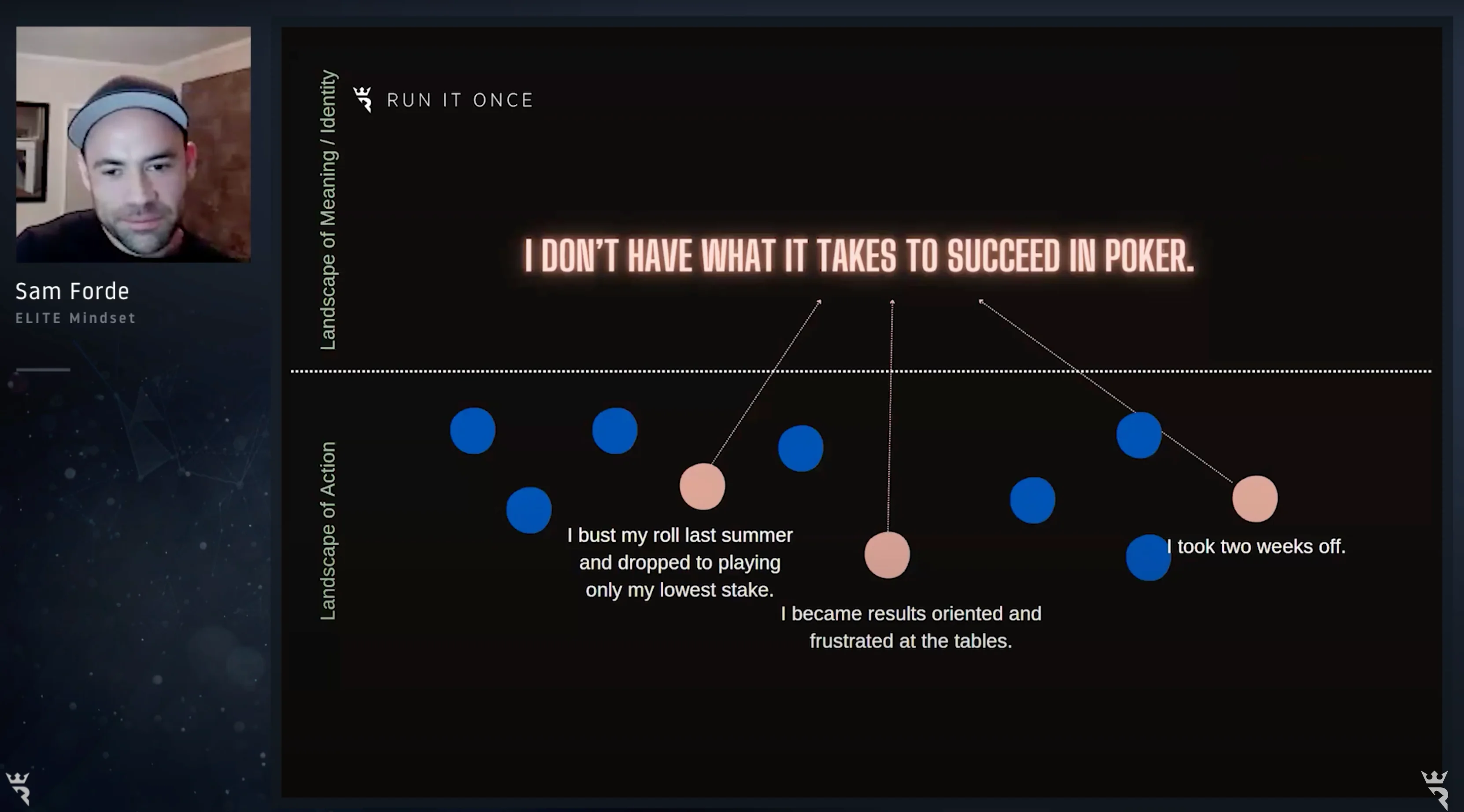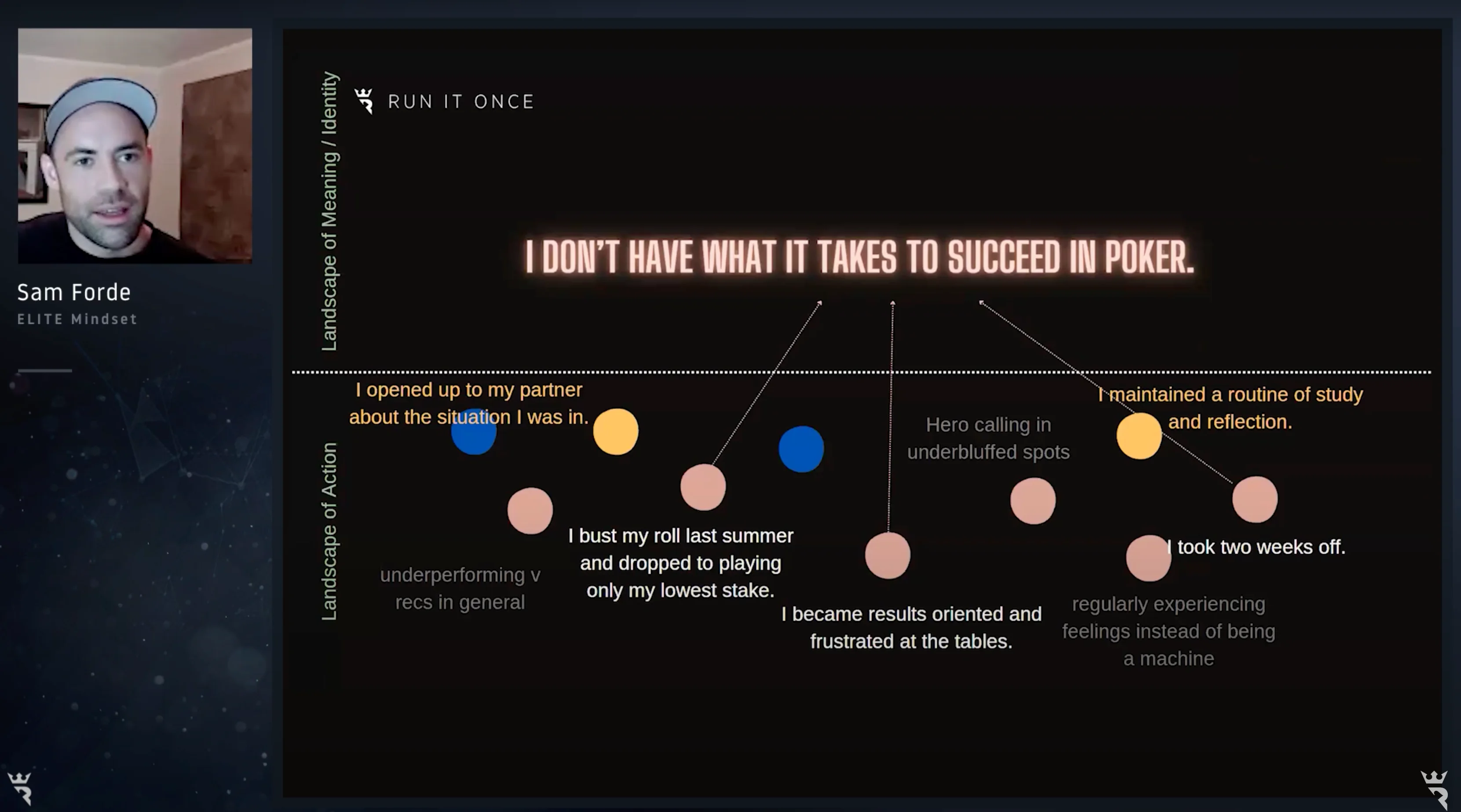 29 Apr 2024 discipline mental game motivation studying tilt Sam Forde, a poker professional, licensed counselor, and university lecturer, offers valuable insights to help you overcome common challenges hindering your progress in the game. By understanding and applying two powerful concepts, you'll be empowered to take the right actions necessary to navigate the day-to-day hurdles faced by poker players. Whether it's mastering strategy, managing emotions, or enhancing decision-making skills, Sam Forde's guidance can help elevate your game to the next level. About author / introduction Hey everyone! I'm a counselor and university lecturer who's been playing heads-up no-limit poker full-time for the past year. I've got some valuable insights to share that I've found useful in my work and studies, and I think they'll be helpful for poker players too. Our poker decisions are influenced by the stories we tell ourselves. Here are some personal experiences: Last summer, I lost most of my bankroll and had to play at the lowest stakes. I became too focused on results and got frustrated at the tables. I took a two-week break to recharge. These events form a narrative that I'm not cut out for success in poker. But narratives aren't set in stone — they're just interpretations of our experiences. By recognizing and challenging these narratives, we can grow as players. In our discussions, we'll explore strategies for reframing our narratives, fostering a healthier mindset, and improving our poker game. Let's embark on this journey together! It's like a saga with various contributing volumes, and here are some extra titles — these recurring events are easily absorbed into the story. I don't have what it takes to make it as a poker player (baffled by fish) This story really blossomed last year. Those who study with me or have coached me will know this. I observed in myself a tendency to preserve mental energy by autopiloting or even actively resisting reflection against recreationals. I wasn't analyzing their game carefully; instead, I'd pigeonhole them into general categories, thinking in generic terms like "he's super passive" or "he's a maniac". These opponents should have been my most lucrative opponents by far, but I dropped the ball again and again. This story here is about skill, performance, and mistakes — things that are really worthy and important to reflect on and review. But the identity story with which I lived was this "not good enough" saga. Real poker players don't feel things It is another recurring event in the series. You'll be shocked to hear that I experience tricky thoughts and feelings every day, and this clashes with broader constructs about being a poker player, a man, a professional, and so on. On some level, it's easy for me to buy into the idea that I should keep a resting Steven Chidwick face in every situation, that I should be able to experience variance as if it were as natural as the rise and fall of a wave. But I don't. For me, I like to cringe, I sigh, I sweat, I pray, I groan, and I get discouraged and depressed — to the delight, I'm sure, of any of my opponents if they're in the session. Hero calling in under bluffed spots Another recurring event that fits into the story "I don't have what it takes to succeed" is a collection of my many adventures hero-calling in under-bluff spots. Maybe you've experienced this too. It's a big river spot where I have a zero EV call in theory, and I'll even think, "Yeah, people don't find enough bluffs here," or "This guy definitely doesn't find enough bluffs here, but maybe this one time he's found a reason to go for it." Even when a simple population node look would show that the call is clearly minus EV, I still find myself making it. This story has a straightforward technical game component, but it also involves a lot of inner elements — hopes, desires, fears and all that sort of stuff. It's really a "what's wrong with me" kind of story, which fits nicely with these other ones into the big "I don't have what it takes to make it in poker" story. Now, let's return all this to the diagram. On the bottom half, you'll see I've got this landscape of action with all the events that we can choose from, and on the top half, the landscape of meaning and identity. These are the stories, the identity conclusions that these events get collected into. The blue dots are just events that haven't been highlighted because they don't fit into this story. So, if it's okay with you, let's just take one of these events which didn't feature in the story. This one, for example, is that during this time — remember, I'd bust my roll, I'd reloaded just enough to play at my lowest stake, but I was frustrated in my gameplay and took some time off — during that period as well, I maintained a routine of study and reflection. And here's another: at this time, I opened up to my partner about the situation I was in. These two events, which don't really fit into this particular story very well, taken together with all the other events highlighted, can actually fit into a story like "I'm a poker player on a journey." I think this is a reasonable conclusion to draw from all of those events combined together. It's not that it's truer than the other story, but this story fits for me and one which serves me much better. I'll quote the therapist and author Alice Morgan here — she's over the ditch in Australia. She says, "Our lives are multi-storied. There are many stories occurring at the same time, and different stories can be told about the same events. No single story can be free of ambiguity or contradiction. No single story can encapsulate or handle all the contingencies of life". But here's a story of mine: poker player on a journey. It's a what I'd call an "I am becoming" type story. And every now and again, usually with the help of people that we care about, we get to write these "I'm becoming" type stories where our intentions are witnessed by oth