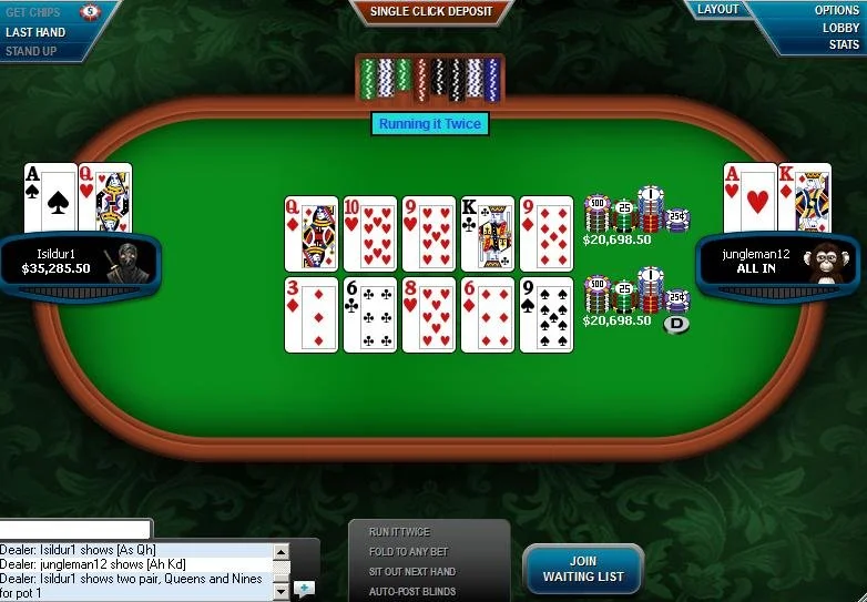 10 Aug 2024 equity EV probabilities variance No one likes bad beats in poker, or in mathematical terms, variance. For many players, including professionals, this is one of the most significant downsides of the game, often leading to negative emotions such as anger, despair, and even the desire to quit poker altogether. Importance of Variance in Poker Due to variance, it’s impossible for a professional poker player to accurately predict their "salary" for the near future, whether it’s for a week, a month, or even a year! This is especially uncomfortable if poker is your only source of income and you need to pay bills or support a family. Nevertheless, any long-term winning player must understand that their profitability is, in fact, due to poker variance. If there were no element of short-term luck, all weak players (aka "fish") – whom we profit from – would quit the game, leaving only the regs. Eventually, even the regs would quit, realizing their inability to beat the rake. It would turn poker into a pure game of skill, like chess. Variance and these occasional streaks of luck encourage fish to make new deposits, hoping that the poker gods will soon favor them. "I just need to wait out the bad luck", they often reassure themselves. Without bad beats, there would be no fish, and without fish, there would be no poker. Variance keeps poker afloat! Moreover, variance allows not only poker but the entire gambling industry — including roulette, slots, lotteries, and more — to live and thrive. The difference between poker and casinos or lotteries is that in poker you play against people, not the casino, so you can create a positive expected value (+EV) for yourself, unlike roulette and lotteries where the rules inherently create -EV for players and +EV for the casino. What is "Run It Twice"? Many of you are likely familiar with the poker feature "Run It Twice," first introduced online in 2009 at Full Tilt Poker, quickly gaining popularity among players and later adopted by most other poker rooms. It was introduced as a response to players' constant complaints about bad beats, intended to slightly reduce the swings of short-term variance in poker. For those unfamiliar, 'Run It Twice' is a feature offered voluntarily to two players who go all-in before the river. Instead of dealing just one board, two boards are dealt. The pot is then split in half, with each half awarded to the winner of each run-out. In some poker rooms, more run-outs are offered, such as three ("Run It Three Times"), where the pot is divided into three equal parts and follows the same scheme. However, the introduction of this feature sparked heated debates within the poker community about its advisability. Yes, it does reduce the swings of variance, which is welcomed by everyone. However, the main debate centers on how it affects EV. Today, we will address this once and for all, leaving no questions unanswered." Does "Run It Twice" Affect EV? The main argument of opponents of this feature is that "Run It Twice" reduces the EV of the player who is currently the favorite. This implies that to reduce variance, we sacrifice our EV, which is unacceptable for winning players. If a player is a long-term winner with a proper bankroll capable of withstanding any variance, they should not sacrifice their EV for the sake of comfort. That's the absolute truth! But is this really the case? Does the number of run-outs affect our EV? At first glance, everything seems logical. For example, in a showdown of KK vs AA, it’s obvious that with two boards, the probability of a king appearing increases. As a result, AA will win the entire pot less often and will split it more frequently. Yes, that’s true. The number of splits will increase, but will this really affect the long-term EV? To answer this question, let’s start with a simplified example. Matchstick Example We have 5 matchsticks: 3 long and 2 short. The rules are as follows: draw one matchstick; drawing a short one means we lose $1, and drawing a long one means we win $1. Let’s calculate the probabilities and EV for this scenario with 1 and 2 attempts. 1 attempt: The probabilities of drawing a short and long matchstick are 2/5 and 3/5, respectively. Therefore, we calculate EV: EV = (+1) * (3/5) + (-1) * (2/5) = 1/5 Thus, our EV for one run-out in this case is +$0.2. 2 attempts: To calculate EV in this case, we need to break down the situation into all possible outcomes: Outcome 1: We win both run-outs. Probability: (3/5 * 2/4 = 0.3 = 30%). Outcome 2: We lose both run-outs. Probability: (2/5 * 1/4 = 0.1 = 10%). Outcome 3: We split the pot. Probability: (1 - (0.3 + 0.1) = 0.6 = 60%). Now let’s calculate our EV: EV = (+1) * (0.3) + (-1) * (0.1) + (0) * (0.6) = +0.2 As you can see, the EV did not change. Yes, the probabilities did. Now, we will win less often in the short term—30% instead of 60%. We will split more often—60% instead of 0%. However, we will lose less often—10% instead of 40%. The redistribution of probabilities is the effect that "Run It Twice" provides, influencing the reduction of variance. However, the long-term EV remains unaffected by the number of run-outs. EV remains unaffected by the number of run-outs. Poker Example From matchsticks to poker! For simplicity and time-saving calculations, let’s consider a spot on the turn, where only one river card remains to be dealt, and we have 15 outs to win. 1 Board: The probability of hitting one of our outs on the river is 15/44. EV = (+1) * (15/44) + (-1) * (29/44) = -14/44 = -0.318 2 Boards: Outcome 1: We win both run-outs. Probability: (15/44 * 14/43 = 210/1892 = 11.1%). Outcome 2: We lose both run-outs. Probability: (29/44 * 28/43 = 812/1892 = 42.9%). Outcome 3: We split the pot. Probability: (1 - (210/1892 + 812/1892) = 870/1892 = 46%). EV = (+1) * (210/1892) + (-1) * (812/1892) + (0) * (1022/1892) = -0.318 In both cases, the EV remains the same! Meta-Factors in Using "Run It Twice" As you now u