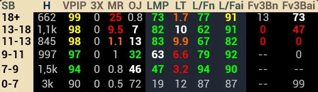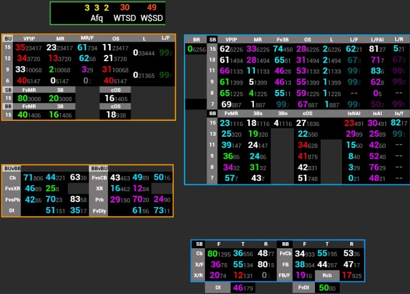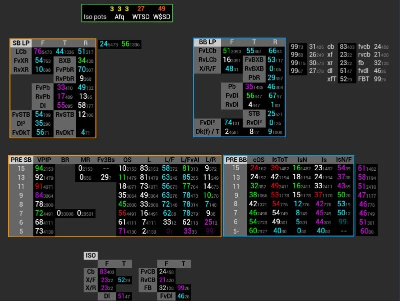 09 Mar 2024 HUD The important statistics to include in your Spin&Go poker HUD are those that can help narrow down your opponent's playing style and implement quick adaptations. Here, we will share our perspective on this matter. What is a poker HUD? HUD (stands for Head-Up Display) is a tool presented in the form of tables that organize information about players (ourselves or opponents) based on the hands played. It fills in automatically according to the applied settings. Technically, there are infinite possibilities for customization! HUDs work with trackers (software that tracks and stores hands). The tracker allows various functionalities, generally offering features such as the replayer and balance monitoring through figures and curves. Some trackers are more comprehensive, providing the ability for mass data analysis (MDA) or range research based on specific criteria. The most important stats in Spins HUD The key to using your HUD effectively is to feel comfortable with it and have a clear understanding of the included statistics. A good HUD should convey as much information as possible, covering both preflop and postflop with strategic distinctions based on stack depths. Given the limited number of positions and depths, it is advisable for the Spin&Go format to employ a more detailed HUD compared to other formats. It is also preferable to have separate HUDs for 3-way and heads-up scenarios. General information General information provides all the relevant details about a situation; it does not involve numbers and remains constant throughout the gameplay. Nickname and number of hands It may seem logical, but to associate specific numbers with each player, you need their nickname! On the other hand, the number of hands serves as an indicator of the reliability of stats. Position It is important to differentiate stats by position as only certain positions are relevant. For example, we don't need to know how the player to our right reacts in SB to a raise from the BU since we will never be in BU and he is in SB simultaneously. In BU we want to know how the player in SB and the player in BB react to a limp or raise; In SB we want to know if BU raises or limps a lot and when he doesn't we want to know how the BB reacts to the different options we have; In BB we want to have information on how opponents in BU and SB play to formulate the best response to their actions. Streets and stack depth Once the stats are detailed by position, we can further differentiate them by street: flop, turn, and river. Stack depth is also crucial when interpreting stats. The more detailed we differentiate stats by stack depth, the more precise our data will be. Be cautious and use the effective depth; for instance, in heads-up if one player goes all-in for 12 bb but the other has only 6 bb, the effective depth is 6 bb. Preflop statistics Preflop is played in every hand, making it the most important part of the HUD that fills up the fastest and which the information will be the most reliable. Openings There are two main types of preflop openings: Open-limps. Just call to 1 bb Open-raises. In form of MR (Min-raise: 2x), BR (Big Raise: more than 2x) and OS (Open Shove: all-in). This stat indicates how often a player initially raises preflop. Folds after opening The Limp/Fold and Raise/Fold indicate how often the opponent will fold his hand when facing a raise or re-raise. This information can incentives us to be more or less aggressive against an opponent who does not sufficiently protect his ranges by being unbalanced. Response to aggression Fold vs Raise, 3-bet or re-raise, Call, COS (Call Open Shove) tell us how our opponent behaves against different openings. Once again, possible imbalances of opponents can encourage us to change the way we play our hands. Postflop statistics Postflop scenarios occur less frequently, but this aspect of the game should not be neglected, as pots quickly grow larger, and differences in equity can become even more significant. Every inaccurate postflop move can potentially have a higher impact on your EV in the long run. Continuation bet (Cbets) The continuation bet, referred to as Cbet, represents the frequency with which a player continues to bet on different streets as a preflop-raiser. This number is a good indicator of a villain's aggressiveness. Cbet response There are three possible stats here: Fold vs Cbet, Call and Raise the Cbet. These responses directly impact our decision to bet or not when we have the initiative in a hand. Donk-bets The donk bet (referred to as Dk) indicates how frequently a player takes over the lead on a street when they are not the one with the initiative. This stat does matter, as many regular players overlook this move, which is still present at a low frequency in GTO. Adapt your strategy based on statistics Seeing statistics is good, but not enough. You have to adapt with the information recovered to set up an exploitative game. There are some very easy and intuitive adaptations to get started: If an opponent has a VPIP that is too high, simply raise him at a higher frequency than normal to punish his weak hands (VPIP too high = range too wide); If an opponent folds too many hands on the flop against CBet, it is advisable to continue betting more often. Conversely, if he defends too much through XR (check-raise), we must unbalance our CBet range in the other direction to make it stronger. Statistics themselves provide clues about the play of our opponents, but be careful to take a comprehensive look when cross-referencing the information to avoid errors! Which tracker to use in Spin & Go? There are many trackers on the market with even more HUDs! Some trackers are more oriented towards MTT, others towards Spin or cash game formats. We recommend Hand2Note or PokerTracker4. These two trackers offer HUDs for sale on their site, but also the possibility of creating your own. Hand2Note Hand2Note is arguably the most comprehensive tracker for a Sp