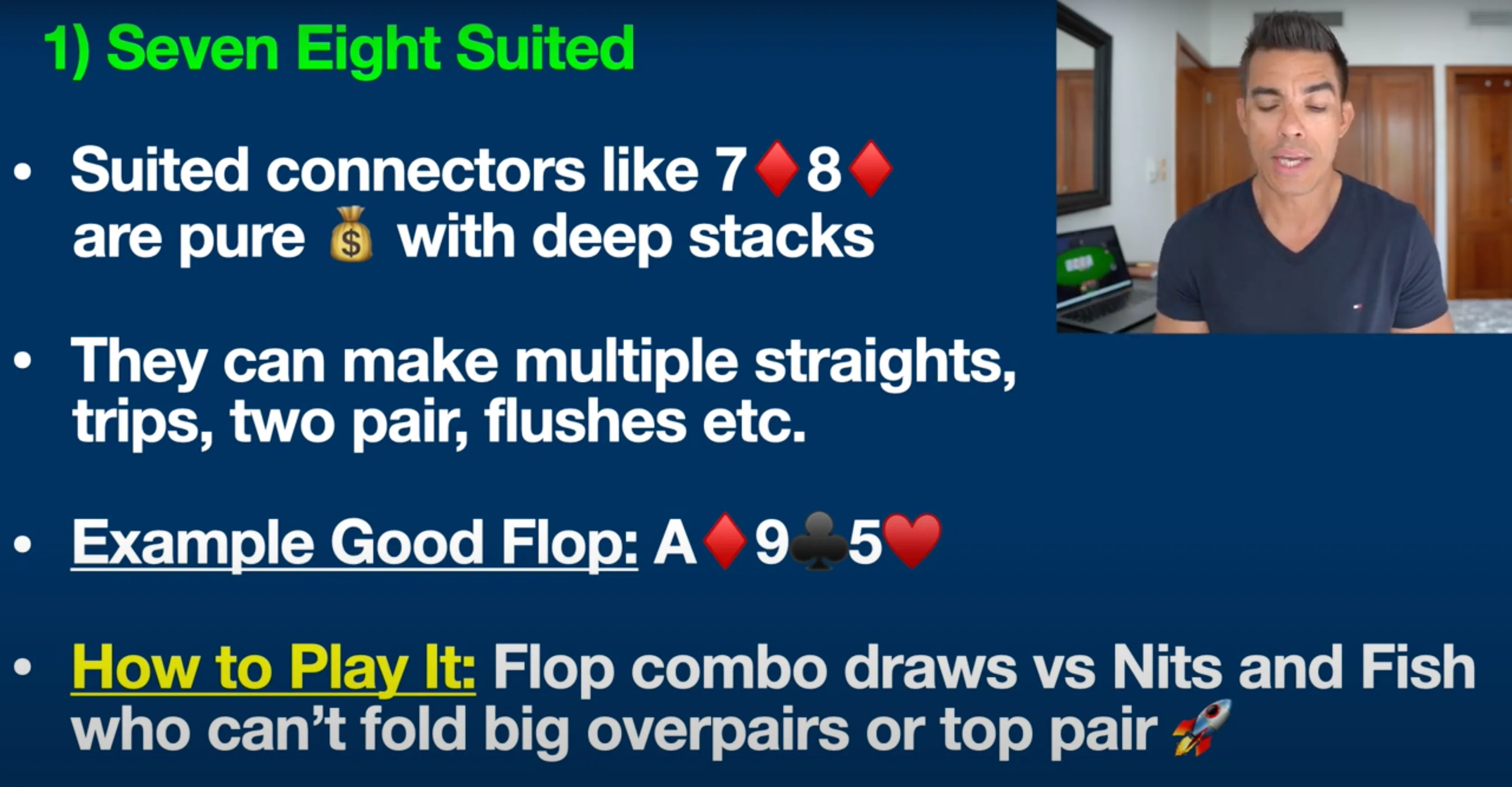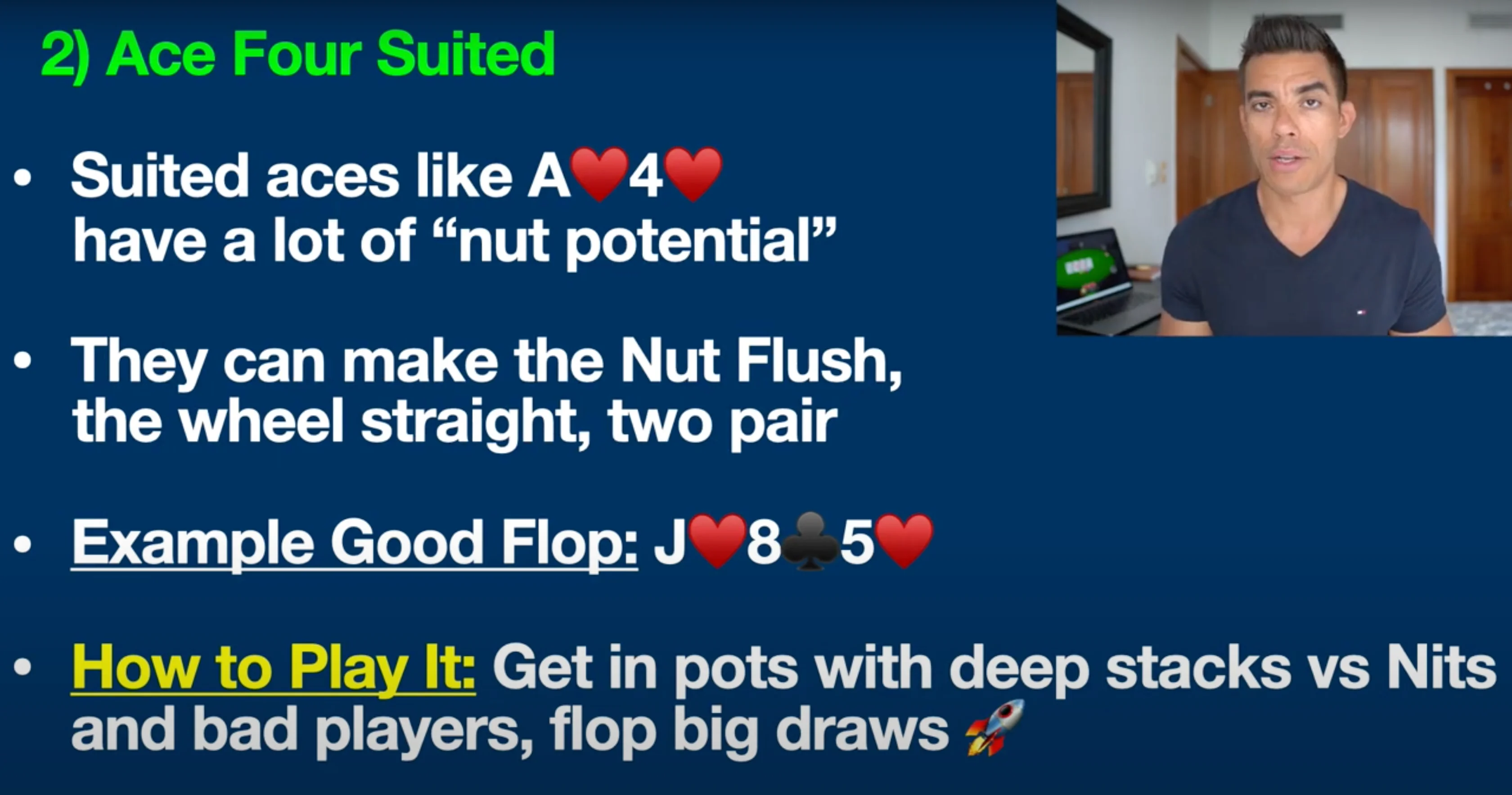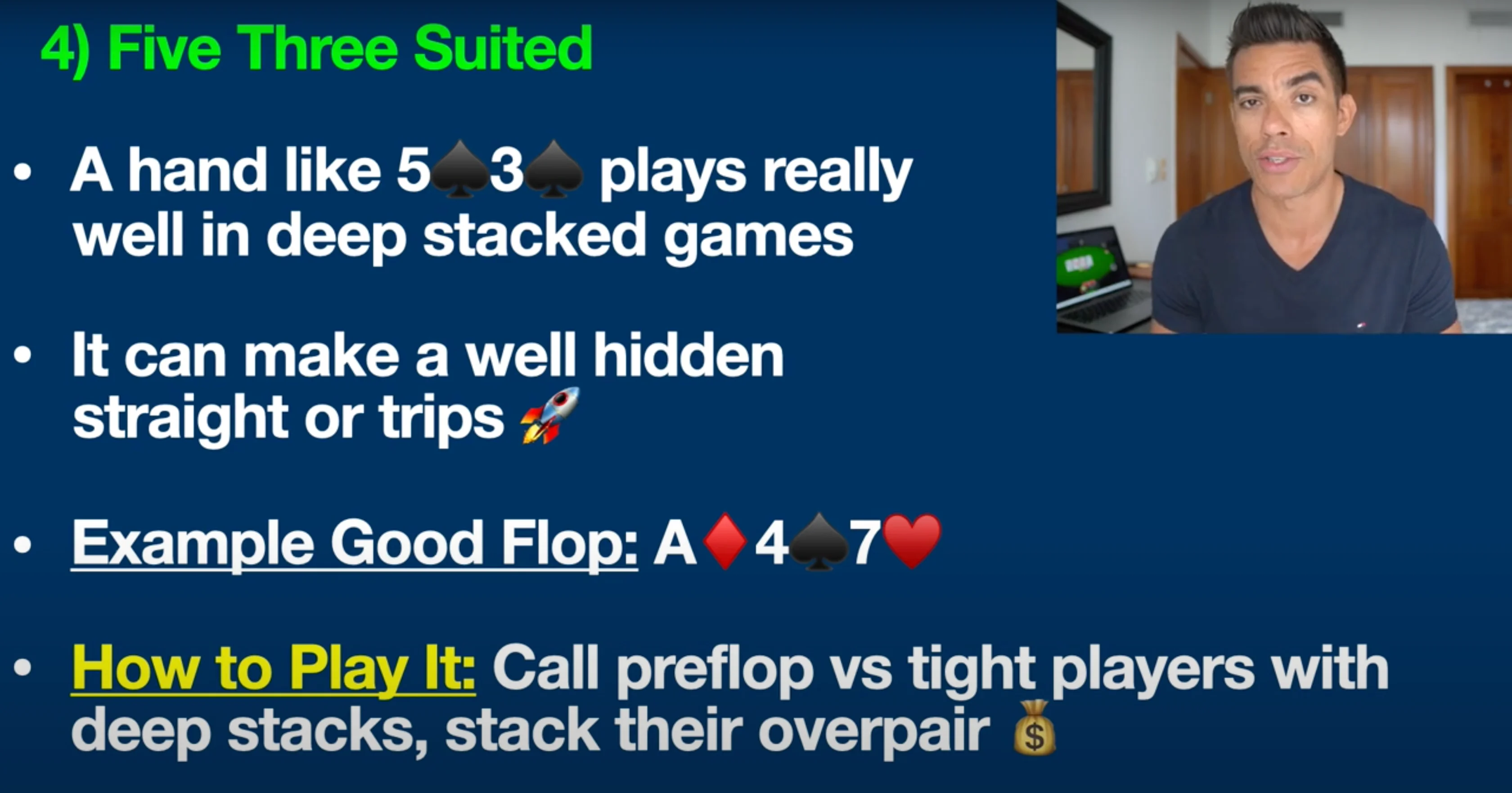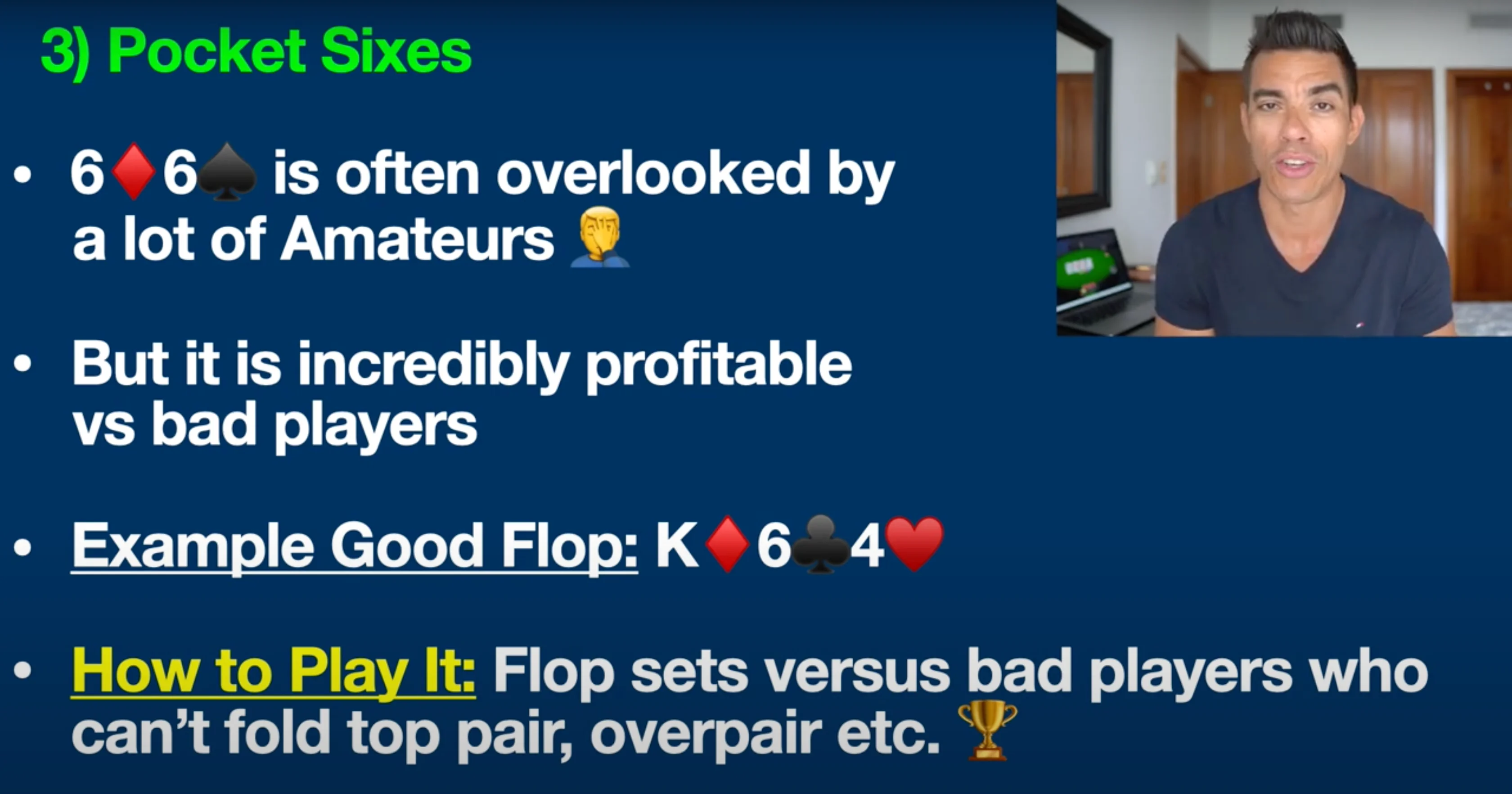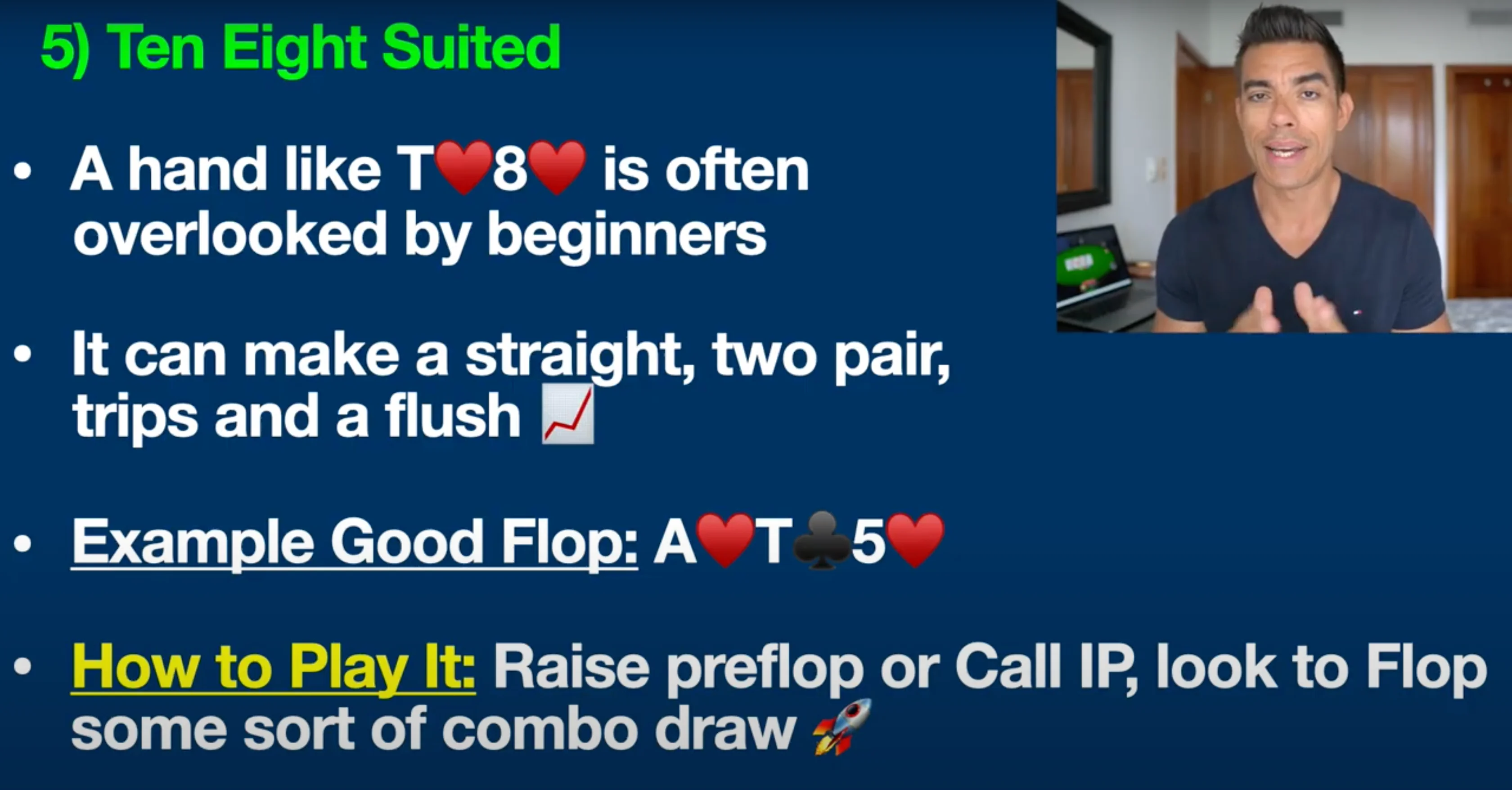 05 Aug 2024 Today I’m going to talk about the five most profitable poker hands that most people still overlook these days. These are the five hands that have made me some of my biggest profits in recent years and I want to share them with you in today's video, including step-by-step examples on how to play each one. So let's jump into it! Counting down from 5 to 1, here are the top five poker hands that most people still overlook. #5: 10-8 Suited Coming in at number five is 10-8 suited. Now, guys, this is one of my absolute favorite hands. I've talked about it many times here, and it's still overlooked by a lot of beginners. This hand can make a straight, two pair, trips, a flush, and so much more. This is kind of like the Swiss army knife of hands. If you have a hand like 10-8 of hearts, an excellent flop would be Ace of hearts, 10 of clubs, and 5 of hearts. On a board like this, we have both a flush draw and a pair, giving us a boatload of outs to win the hand. We might even be ahead right now with the middle pair. Remember, there are nine more hearts in the deck, which would give us a flush — a nearly unbeatable hand. There are also two more 10s and three more 8s in the deck, which could give us trips or two pair. That is why a hand like this is so profitable. If you're up against tighter players who can't fold a hand like Ace-King on this board, or recreational poker players (our fishy friends) who don't fold anything, this hand can be absolute money against these kinds of players. You want to raise the preflop with this hand or call in position. On your screen right now, you can see the positions at the poker table, just so you understand what I'm talking about: The cutoff and the button are by far the most profitable seats at the poker table. I've talked about this — the reason why is because you're going to get to act last on the flop, turn, and river—a massive, proven statistical advantage. A lot of the hands on this list really benefit even more from these positions because they allow you to get more raises in, more value bets, or even fold your hand and save money if you think you're beat. So, bottom line: you want to play a hand like this against tighter players who have trouble folding a big top pair or overpair type hand, and also against recreational players. You want to try to flop some sort of big combo draw like this, where you have a pair plus a flush draw. #4: 5-3 Suited A hand that many people overlook these days is 5-3 suited. This is another one of those sneaky suited one-gappers that can play particularly well in deep stack games. By deep stacks, I mean poker games where you have 100 big blinds or more. For example, in a $1/$2 cash game, 100 big blinds would be $200. Many poker tournaments also start off with deeper stacks in the beginning stages, which is where hands like 5-3 suited can be highly profitable. In No Limit Texas Hold'em, you can bet any amount at any time, giving hands like this a lot of potential. 5-3 suited can make a well-hidden straight, trips, two pair, and more. Let me give you an example of a good flop for this hand: Ace of Diamonds, Four of Spades, and Seven of Hearts. Many beginners might overlook this spot, thinking they only have five high and nothing on the board. However, we actually have a gutshot to the wheel straight draw here. If a two comes on the turn or river, we make a well-hidden wheel straight: Ace, Two, Three, Four, Five. Additionally, there's a spade on the board, giving us a backdoor flush draw. If spades come on the turn and river, we also make a nearly unbeatable flush. Similar to the previous hand, you want to play 5-3 suited preflop against tight players, especially in position with deeper stacks, and look to stack their overpairs. This is one of my favorite hands to play against tighter, nittier players who have trouble folding top pair or overpair hands like Ace-King. Recreational poker players also tend not to fold these hands, making 5-3 suited a money-making hand in these situations. This is one of my absolute favorite hands to play against the tighter, nittier players you often encounter in today's games. If they hit the top pair with a hand like Ace-King, they're not folding, and we know recreational poker players won't fold that hand either. #3: Pocket Sixes Let's move on to hand number three, which is often overlooked: pocket sixes. Many beginners and amateurs still underestimate these small pocket pairs, but they can be incredibly profitable, especially against recreational players, or our "fishy" friends. The key with pocket sixes is to look for flops that can give you a set. For example, if you have pocket sixes and the flop comes King-6-4, you’ve flopped a set. Although you'll only hit a set about 12% of the time, that 12% can be significant. I've built a career out of flopping sets against players who can’t fold hands like Ace-King or King-Queen in such situations. These hands are very profitable because opponents often won’t put you on a set, allowing you to stack them frequently, especially if you play aggressively by raising on the flop and turn. #2: Ace-Four Suited Ace-Four suited is another hand I frequently discuss here. Hands like Ace-Four suited, regardless of whether it’s Hearts, Spades, Clubs, or Diamonds, have tremendous nut potential. Let me explain what I mean. This hand can make the nut flush, a wheel straight (similar to the potential of Five-Three suited), and even excellent two-pair combinations. In poker, the term "nuts" refers to the best possible hand or one of the best possible hands, and it’s crucial for your success to be drawing to the nuts as often as possible. That’s the beauty of a hand like this. For example, a good flop for Ace-Four of Hearts might be Jack of Hearts, Eight of Clubs, and Five of Hearts. In this situation, you’re drawing to the nut flush. If an opponent has a hand with two hearts, like Queen-Ten of Hearts, and a heart appears on the turn or r