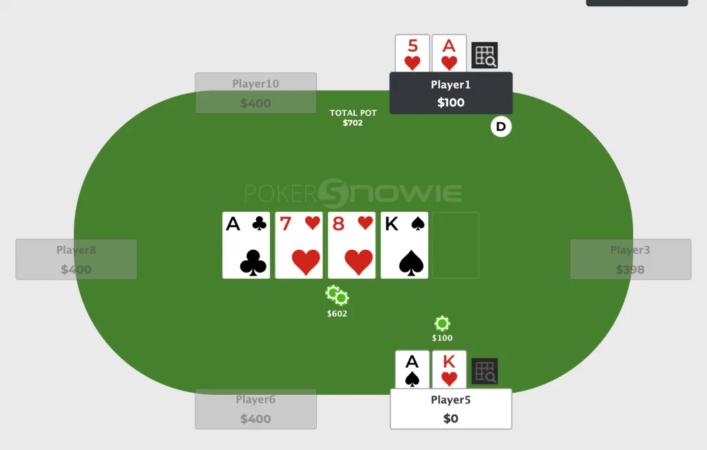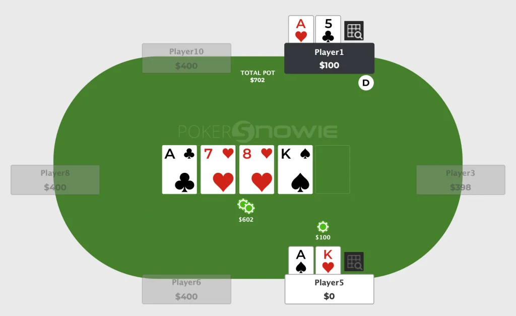 29 Jun 2024 bet sizing pot control You might have heard the term "pot-committed" before. However, it's often misused in situations where a player is not actually pot-committed, leading to statements like: "I have to call because I'm pot-committed..." Let's clarify the correct understanding of being pot-committed. What is Pot-Committed? Pot commit refers to a situation where the pot odds are better than the probability of winning. It is often shortened to "committed." Typically, this term is used when the pot has become very large compared to the remaining stacks, and despite having a low chance of winning, the odds justify calling an all-in bet. Understanding the concept of pot commitment requires knowledge of pot-odds. If you're unfamiliar with pot-odds or outs, consider reading articles on those topics first. Examples of Pot Commitment Let's look at a situation where you might be pot-committed. Imagine you have A♥5♥, and your opponent has A♠︎K♥. The turn community cards are A♣︎7♥8♥K♠︎. You've already put $300 into the pot, which has grown to $600, but you only have $100 left in your stack. Your opponent goes all-in. What should you do in this situation? In this case, you have no choice but to call. Your odds are 8 to 1. ($600 pot + opponent's bet $100 + your call $100) / $100 = 8 Therefore, the required winning percentage to call is 1/8=12.8% Since your hand (A♥5♥) has an 18.18% chance of winning, the odds are in your favor. This situation is referred to as being pot-committed. Common Misconceptions About Pot Commitment Pot commitment is sometimes described as a situation where "the pot has grown so large that calling is the only option," but this is only correct when the odds are indeed favorable. A large pot does not automatically justify a call. Consider the same scenario, but with A♥5♣︎ instead. No matter what card comes on the river, you cannot win. Therefore, even if the pot is huge, you should not call. In real situations, you should often think in terms of ranges, so it's not always this straightforward. However, if the pot-odds aren't favorable, you are not pot-committed. Conclusion Here are the key points to understand about pot commitment: Definition: Pot-committed means the odds are favorable for an all-in call. Mandatory Call: If pot-committed, you should not fold. Misconceptions: Being pot-committed does not justify incorrect calls. Frequently finding yourself pot-committed suggests you should reconsider your strategy to avoid getting into such situations. Being pot-committed restricts your options. Players who frequently find themselves pot-committed should be more cautious and consider if they could have prevented the situation by controlling the pot size.