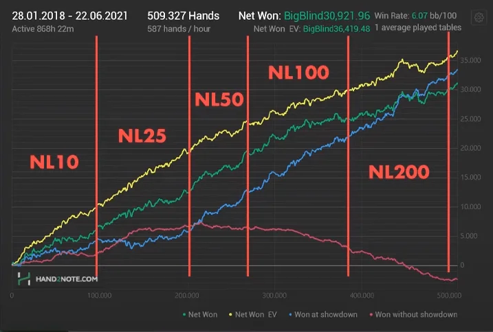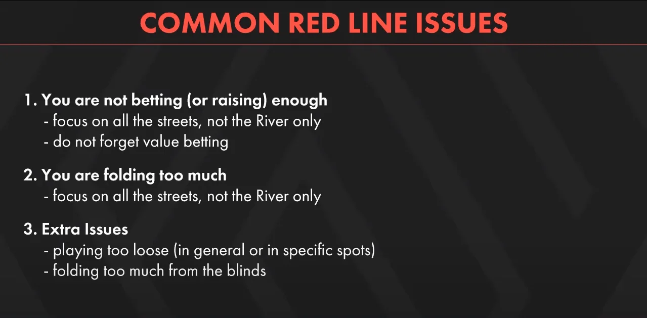 15 Feb 2024 Hello everybody. We all want high winrates and beautiful graphs. And oftentimes we hear from all directions that we should take care of our red line winnings, and not only win by having the best hand on showdown. Today we are going to speak about how to improve the unfamous red line in your overall graph with some tips and conceptions. Let's begin. What is the Red Line and what does it mean? The red line is the non-showdown winnings line we see on the graphs of tracking softwares. Such softwares can be Hand2Note, Hold'em Manager, Poker Tracker, etc. It tells us how much we win or lose when the hand doesn't get to showdown. Guess what: the line showing our profit before showdown is always red. If you sum it up with the blue line, which represents your showdown winnings, you will get your total profit - the green line. Many players struggle to have a winning red line or anyway a decent one and so I thought it was nice to make an article about that. I think the first thing to do is to understand how the red line goes up and down. It may be obvious to some of you, but I think it's important to have it in mind during all this article. The red line rises the more (1) your opponents fold and (2) you don't fold. It is not just making your opponent fold. Every time you don't go to showdown and lose the pot, it's bad for your red line. This also means that if you play like a nonsense monkey like betting any hand and never folding against whatever action, your red line is going to be awesome. But in that case your green line (net winnings) will hit the bottom because you will lose at showdown (your blue line) a lot more money than you won by making your opponents fold and never giving up. It is important not to follow any misconceptions that the higher the red line the better you play. No! All that matters is your total profit, which is shown on the green line, which is the sum of your red and blue lines. So Player A with a crazy red line which brings him about 120% of profit, but a terrible blue one which burns the rest, will be much less profitable than Player B, who makes about 125% of his net winnings at showdown and tries not to lose more than 25% before showdown. How high or low your red line should be depends mainly on the field you're playing. I'm going to repeat it again because this is a very important point: How your red line actually looks depending on how you play, but how your red line should look depends mainly on the field you're playing. Everybody can have an awesome red line: it's enough to never fold and to always bet, but it doesn't mean that it's the correct choice on the specific field you're playing. An example of how the red line can depend on different player pools During my bankroll challenge I played the all stakes from an NL10 to an NL500 Zoom, and it can be seen that my red line was much better at the lower stakes than it was at higher stakes. Anything that goes off the field and because of the quality of my opponents. Look how my red and blue lines changed on different stakes while my overall winrate remained almost the same. When moving up in stakes my overall winrate dropped insignificantly, buy wherever I played - main profit came from the blue line. The red one dropped the more the higher was the stake, I'm not saying that my red line was correct in one or in the other field. I'm just saying that the same player will have different red lines in different fields. If you are not satisfied by your red line, there are several common issues that may affect your game and your red line, and I think it's worth to show them to you. Okay, let's assume that you are confident that your blue line is fine, and now it's time to try to raise the red line. Common issue #1: Not betting (or raising) enough You may not be betting (or raising) enough on one or more streets. It doesn't matter - which street: some people just focus on the river like "I'm not bluffing enough on the river" - not necessarily. Betting a lot on the flop is already good for your red line because your opponents will overfold a ton of hands right away. Also keep in mind that I'm not speaking about bluffing or value betting. Both kind of bet types are good for your red line because even when you are value-betting and your opponents fold, your red line will go up because you've won the pot before showdown. On the other hand, if you never value-bet, you go more frequently to showdown, and then your red line is going to be a bit worse. Common issue #2: Overfolding in medium and BIG pots You may be folding too much: on one or more streets. Same for the previous common issue. A lot of people just focus on the river, but they should think about all streets and their overall results. For your red line, it's always better to overfold a questionable hand right on the flop and continue with the strongest hands than to call on the flop and fold on the turn or river - no matter why. Especially, when you are out of position. The smaller the pot lost, the less your red line drops. Folding too much on the river when the pot is already big dramatically drops you red line because you lose 20-30-50 big blinds, instead of just avoiding such a spot beforehand, quitting a tough spot right on the flop or not getting into it on the preflop. Especially, out of position when you know the equity which you can realize OOP is 2-3 times less than the raw equity of your hand at that moment. Everytime you fold your red line goes down. The bigger pot you give up without showdown, the more your red line drops. As a consequence of that I would also like to add the two other common issues that may affect your red line and you may not even think about them. Common issue #3: Playing too loose The looser the range, the weaker and the less bets or calls you can make with it profitably. The first one is that you may be playing too loose in certain dynamics: in general or in specific spots that occur not so rarely. Because if you play too lo