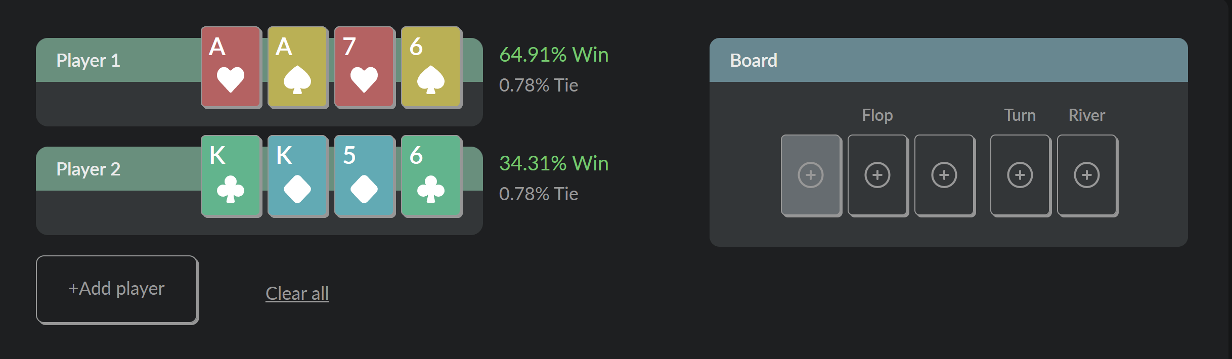 Free poker equity calculator for Pot-Limit Omaha. Calculate your chances of winning against any hand on Preflop, Flop, Turn or River.