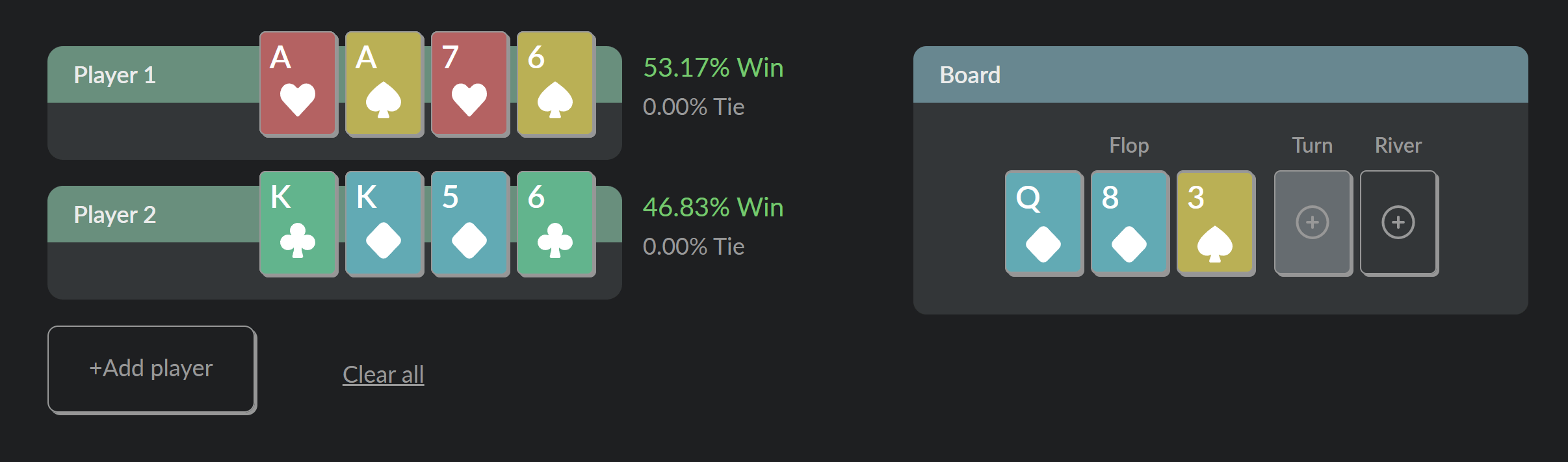 Now, let’s assume you did not go all-in pre-flop and come to the flop: Q♦8♦3♠. The equity of the hands changed. So, according to the calculator, if you both go all-in now, your equity drops to 53%, due to the flush draw available to your opponent.