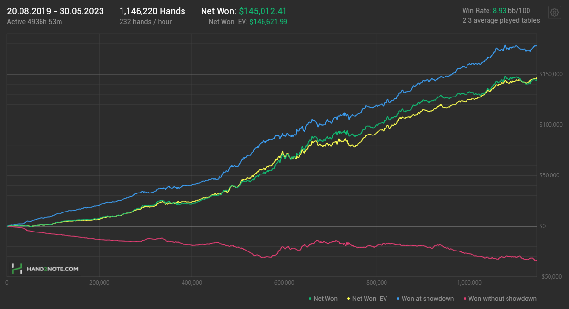 My journey in the world of professional poker began with a humble deposit of 10 euros. Initially, I immersed myself in high-volume play, relying on a simple preflop strategy in 0.25$ turbo SNGs. Despite my young age at the time, I managed to steadily grow my bankroll over the next few years. Eventually, I transitioned to grinding MTTs, where I achieved a profitable record of approximately $60,000 in winnings (you can verify this on Sharkscope under "g.andrei95"). However, due to the inherent variance of MTTs, I felt compelled to explore cash games in 2019. Starting at nl50, I gradually worked my way up to nl200, which I have been grinding for the past three years. Throughout my poker journey, I have amassed significant experience, having played around 1.1 million hands, with the majority of them at nl200. My efforts have resulted in an impressive EV winrate of 9.3bb/100.