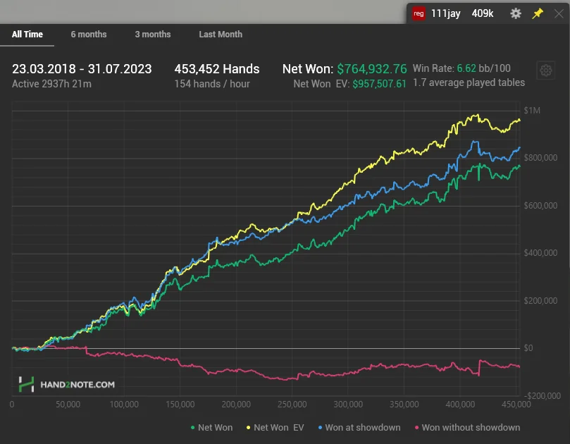 GTO CFP live session database analysis Ever feel like you're swimming against a relentless tide of information? Despite the rapid influx of new solvers and mass-produced videos, they seem to offer no substantial innovation or change. It's as if everyone is paddling in the same direction using the same tools, watching the same videos, playing the same strategies, and following the same script. But ask yourself, if everyone is doing the same thing, how can anyone truly excel? Surely, to outperform the rest, a different approach is needed, one that diverges from the common path. I've spent a lot of time thinking about this - how we can escape this cycle and inject some creativity back into the game. My journey began as a high-stakes regular, eager to drastically improve my game, and continued as a coach, aiming to distill my accumulated knowledge into teachable, fundamental concepts. Graph without my best performance room (GG network): Results in reg wars only: I believe I've found a way. With over 15,000 hours of personal play and study, hundreds of hours of coaching, and a continually updated 50-hour theoretical course on nl cash since 2017, I've been honing this approach. My focus is on the timeless principles, concepts, and patterns that will always stay relevant. Only a small portion of the content is dedicated to the ever-changing specifics of the current field. Once these core concepts are deeply understood, they become a part of you. My goal isn't to teach you to mimic a GTO, but to truly understand it and use it as a foundation for building your own unique exploits. I’m not here to promise a quick fix or a magic pill. What I offer is a study system that's been tested over time and proven effective in the toughest high-stakes games. Yes, it will demand a lot of dedication and effort, but the payoff, as demonstrated by myself and many of my students, is absolutely worth it. The best part? You can try it out risk-free, due to my flexible return policy. https://www.jpokerschool.com/
